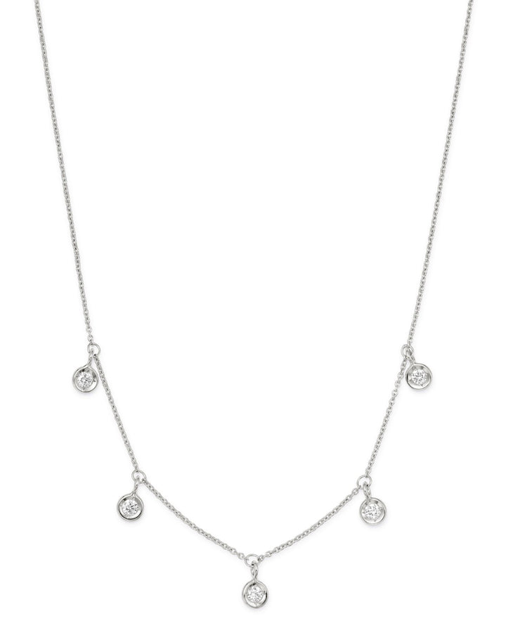 This Dangling Droplet Necklace by Roberto Coin from the Diamonds By The Inch collection showcases five bezel-set diamonds elegantly spaced along a chain. Its delicate yet striking design is perfect for everyday wear or layering with other pieces.