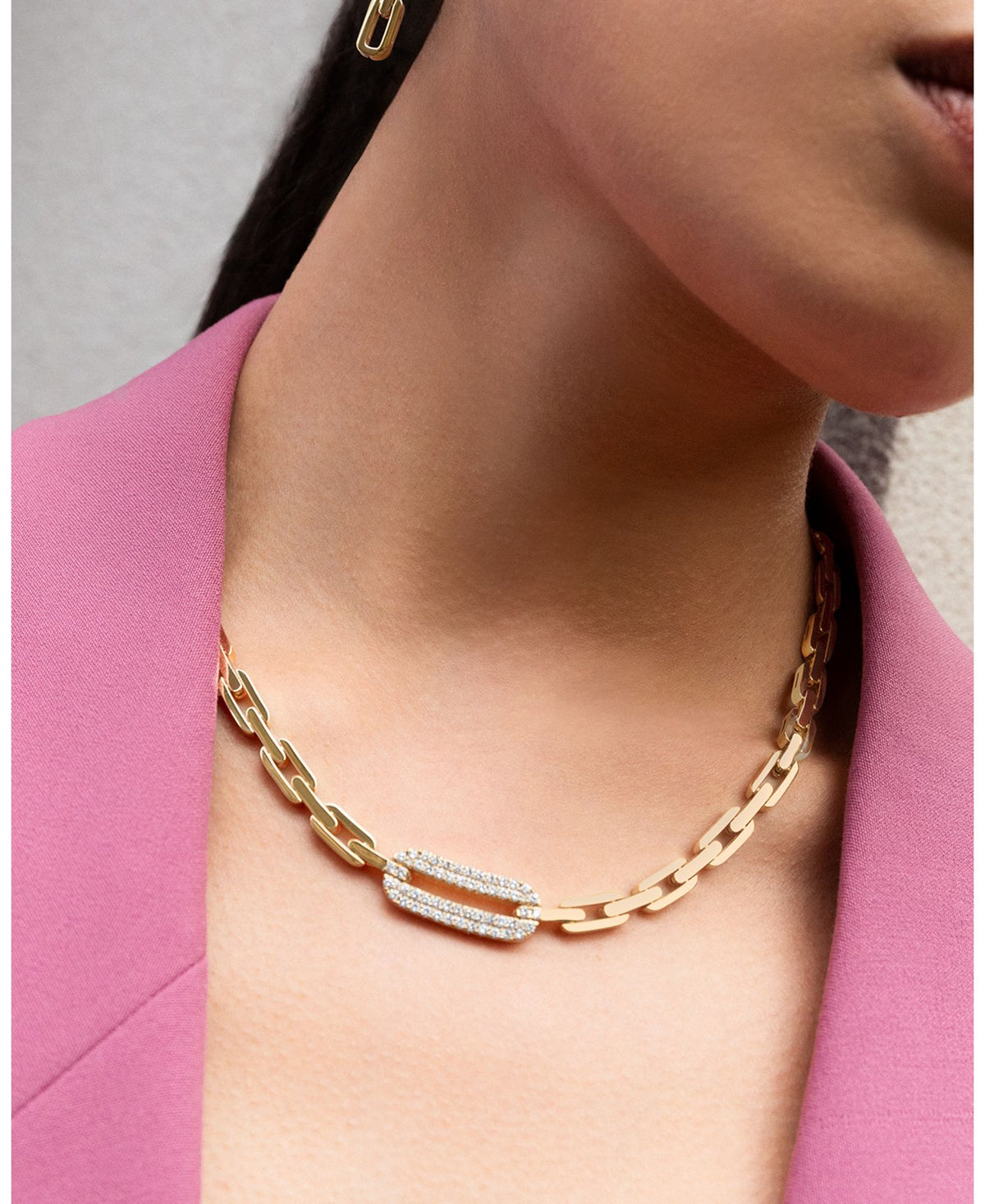 This Navarra Diamond Pavé Chain Link Collar Necklace by Roberto Coin is a glamorous addition to the Navarra collection. Its standout diamond pavé link adds sparkle and sophistication to the bold yellow gold chain link design, perfect for elegant occasions.