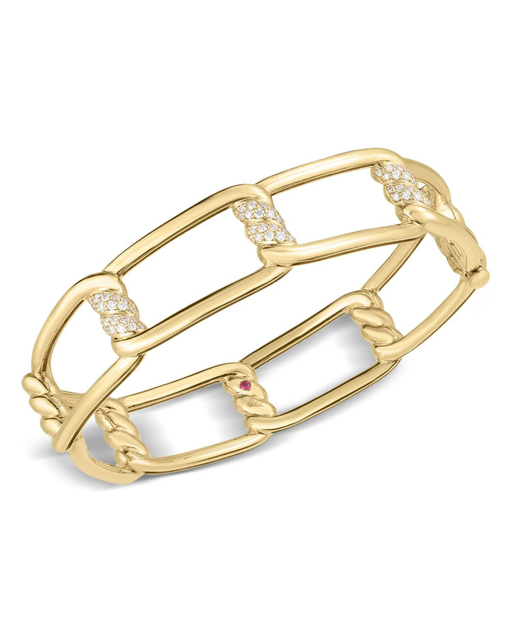 This Cialoma Diamond Open Link Bangle Bracelet by Roberto Coin is bold and contemporary. From the Cialoma collection, its open link design is accented with shimmering diamonds, making it an eye-catching addition to any ensemble.