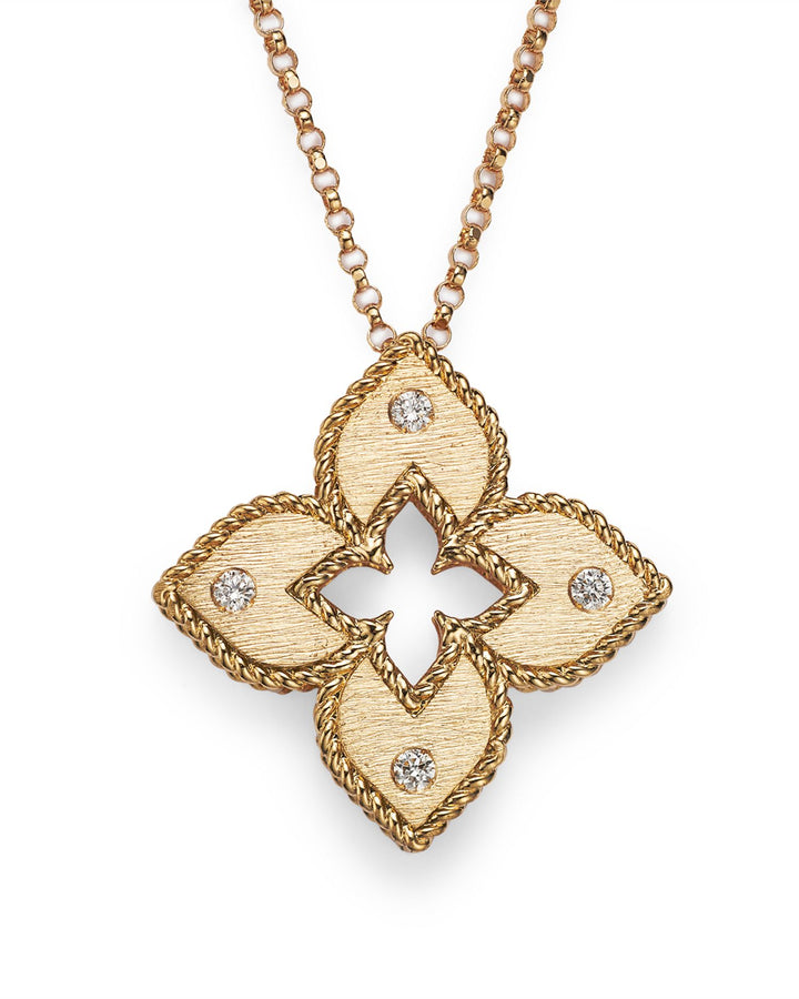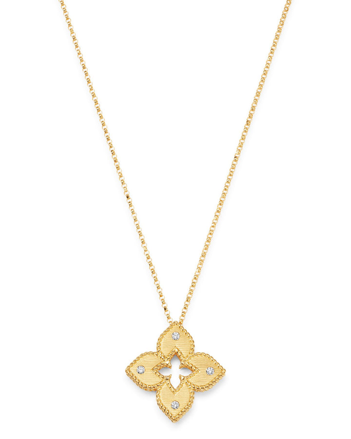 This Petite Venetian Princess Diamond Pendant Necklace by Roberto Coin is a delicate and elegant accessory. From the Venetian Princess collection, its petite flower-shaped diamond pendant makes it ideal for layering or wearing solo.