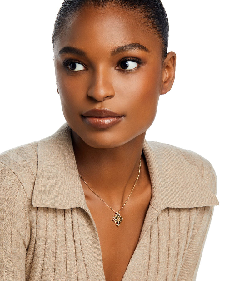 Handcrafted in 18K yellow gold. Features diamonds totaling 0.06 ct. t.w. Necklace measures 17'L with a 0.75' pendant drop and a lobster clasp closure. Made in Italy.