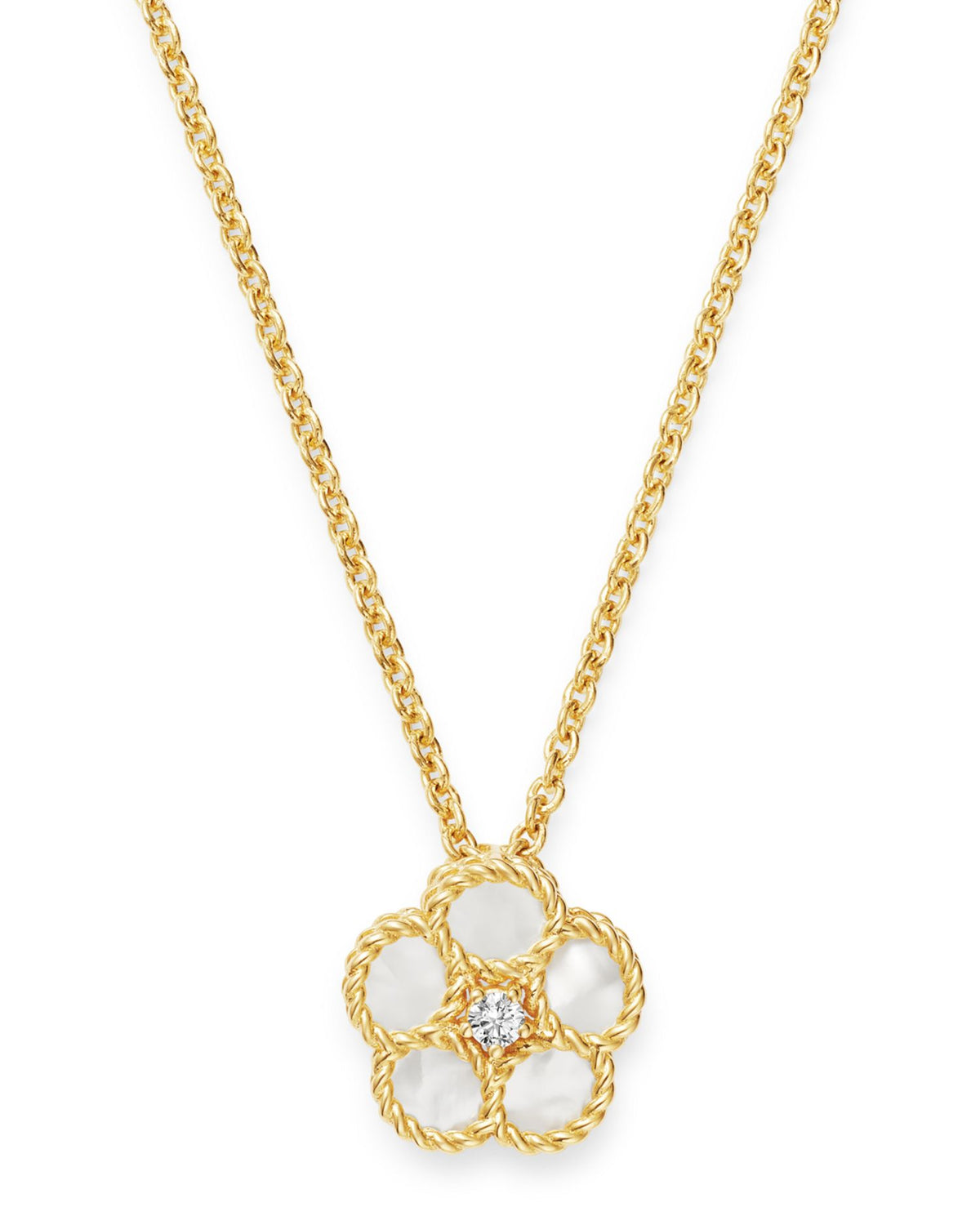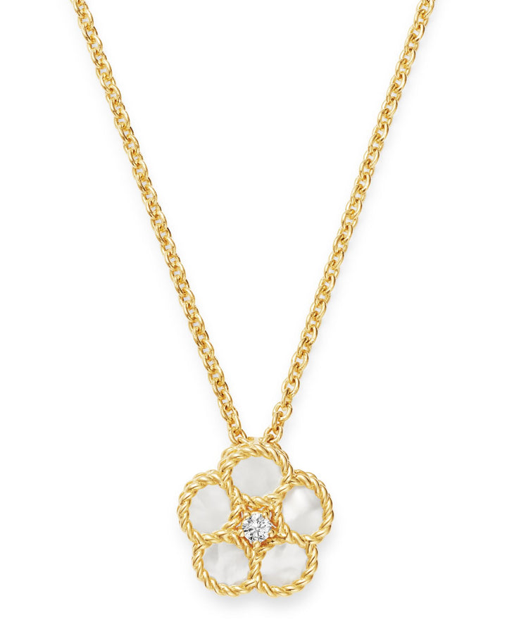 This Daisy Mother-of-Pearl & Diamond Pendant Necklace by Roberto Coin is a graceful and exclusive design. The luminous mother-of-pearl daisy pendant with a diamond center hangs delicately from a gold rope chain, offering timeless charm and sophistication.