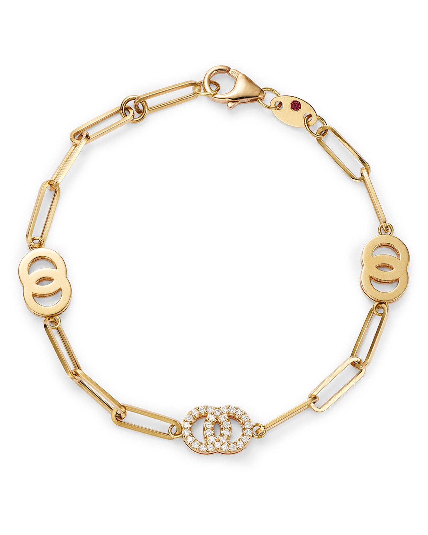 This 18K Yellow Gold Double O Paperclip Link Bracelet with Diamonds by Roberto Coin is a Bloomingdale's 150th Anniversary Exclusive. The double O motif, inspired by the Bloomingdale's logo, symbolizes double happiness, with a diamond embellishment adding an exquisite touch.