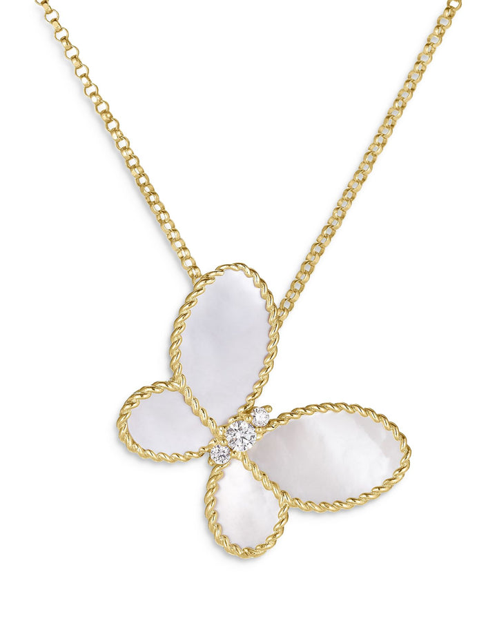 This Jasmine Mother of Pearl & Diamond Butterfly Pendant Necklace by Roberto Coin is a whimsical yet elegant statement. From the Jasmine collection, its delicate butterfly design is crafted with luminous mother of pearl and sparkling diamonds, making it a charming addition to any jewelry collection.