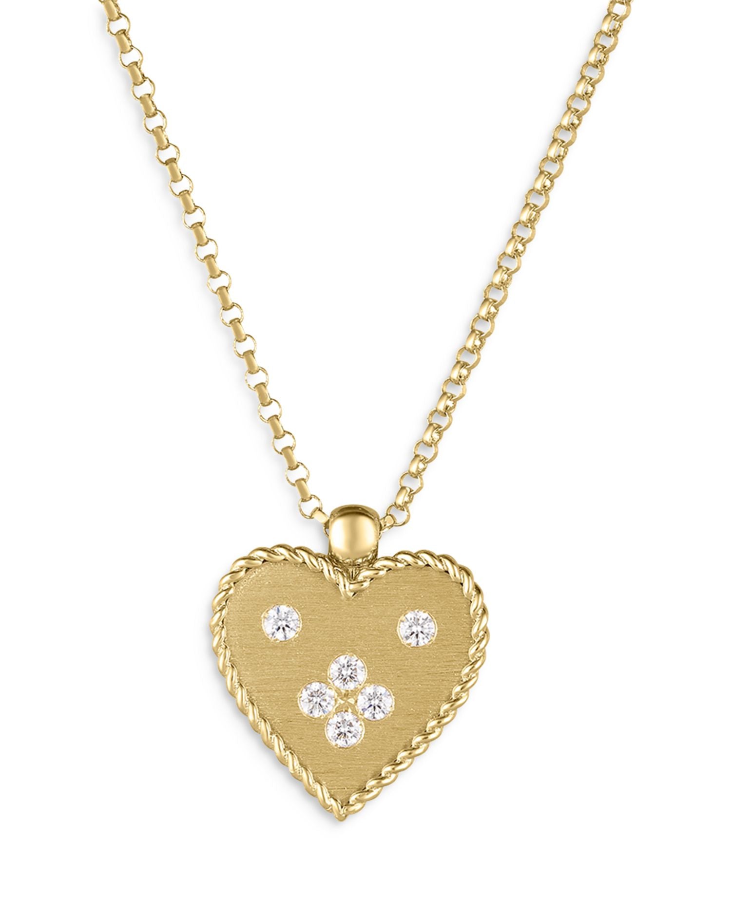 This Venetian Princess Diamond Heart Small Pendant Necklace by Roberto Coin is a sentimental and elegant design. From the Venetian Princess collection, its satin-finished heart pendant with diamond accents and rope detailing adds a timeless charm to any outfit.