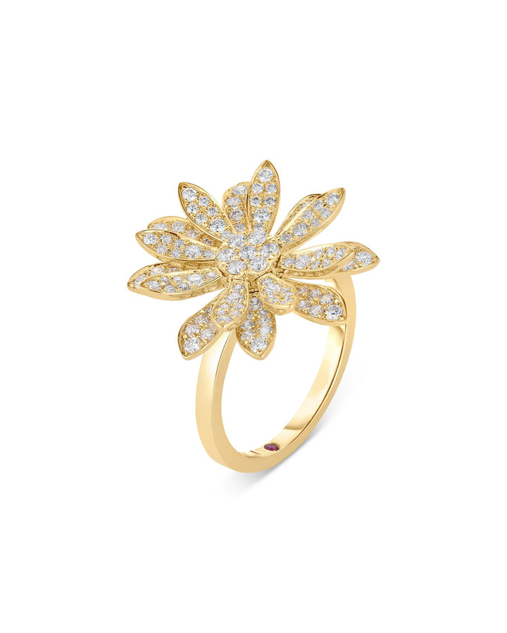 This Margherita Diamond Flower Statement Ring by Roberto Coin is a glamorous nod to floral elegance. From the Margherita collection, its posh diamond petals set in radiant yellow gold create a bold and stunning statement piece.