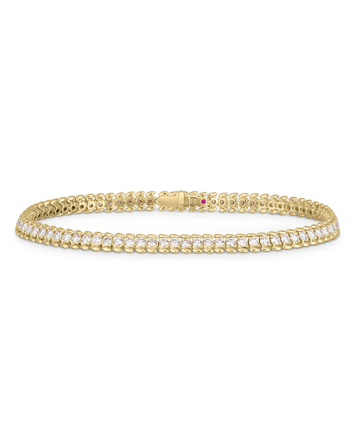 Crafted in 18K yellow gold with 2.68 ct. t.w. diamonds. Measures 7' in length and secured with a box clasp closure. Features Roberto Coin’s signature synthetic ruby on the interior. Handcrafted in Italy.