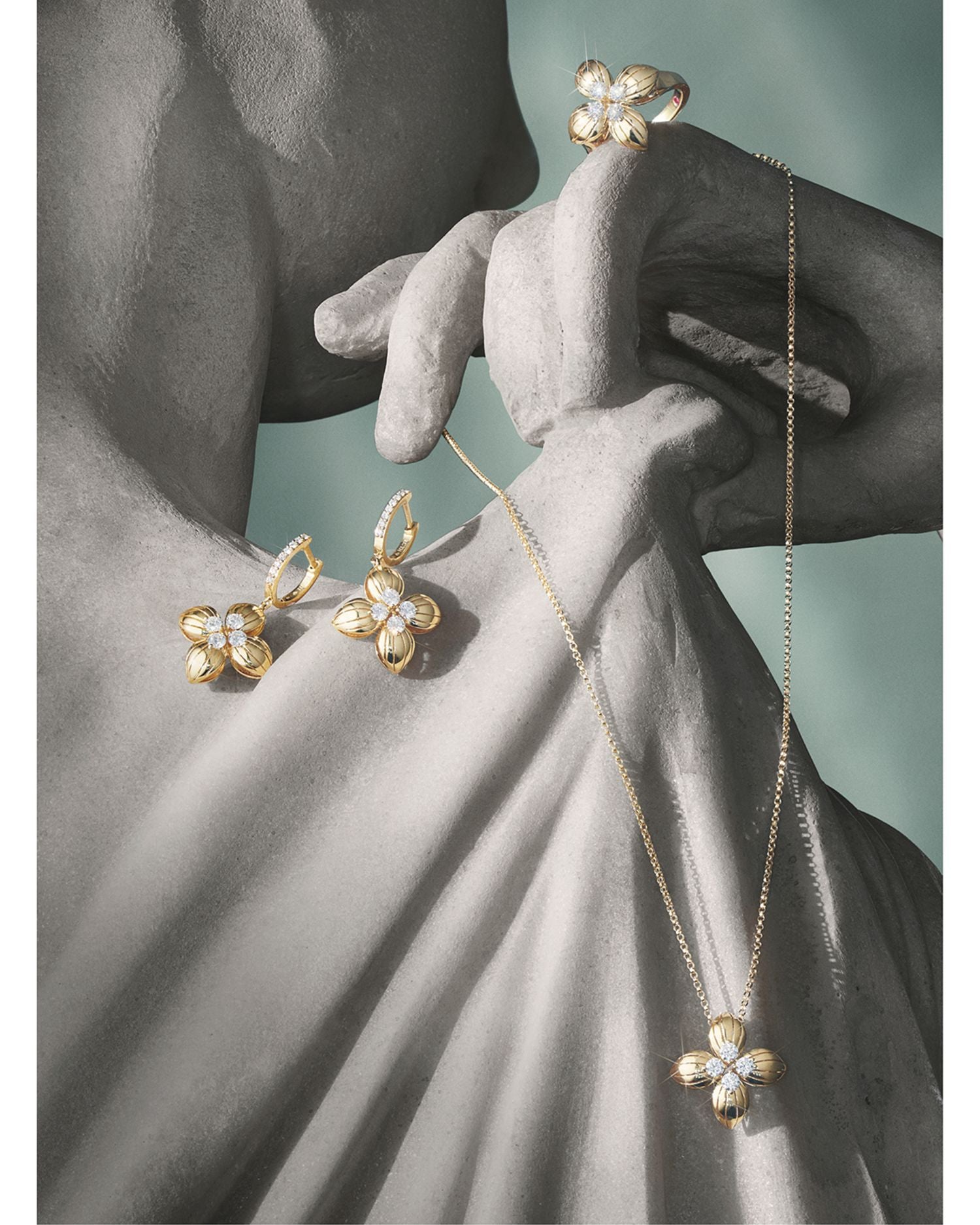 This Love in Verona Diamond Flower Ring by Roberto Coin is a vintage-inspired masterpiece, exclusive to the collection. The four-petal floral motif, a symbol of romance, reflects the charm of Verona. Crafted in radiant yellow gold and accented with sparkling diamonds, this ring celebrates timeless elegance and Italian craftsmanship.
