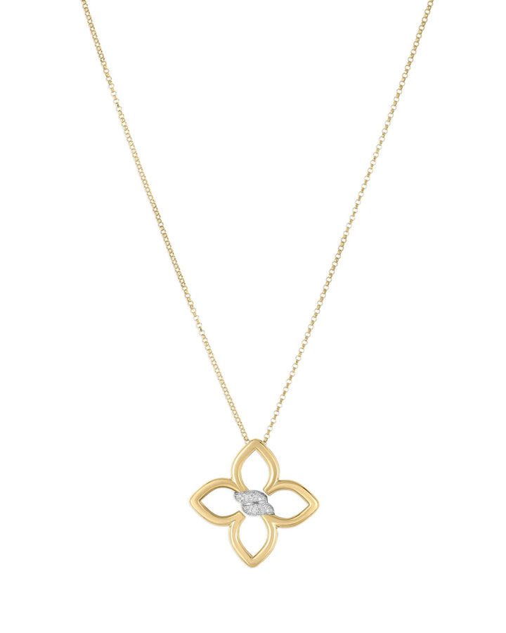 This Cialoma Diamond Flower Pendant Necklace by Roberto Coin is a delicate and refined piece from the Cialoma collection. Featuring a charming flower motif adorned with diamonds, it brings an elegant sparkle to the neckline. Perfect for layering or wearing alone as a subtle statement of sophistication.