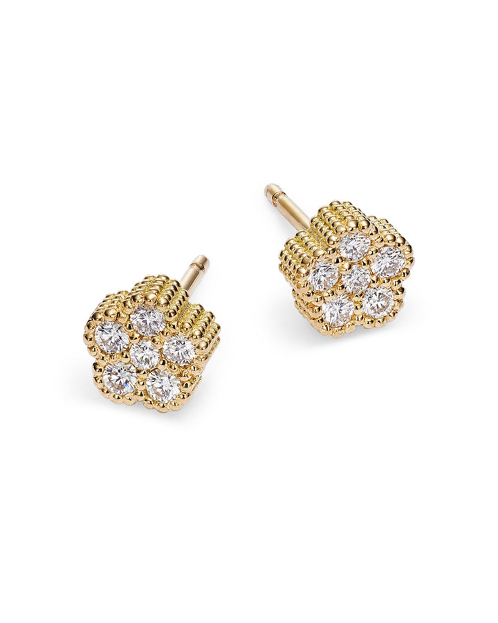 Handcrafted in 18K yellow gold. Features diamonds (0.27 ct. t.w.; GH/SI1 color/clarity). Earrings measure 0.125'L. Post back closure. Includes Roberto Coin’s signature synthetic ruby on the interior. All gemstone carat weights are approximate; variance may be 0.05 carat. Made in Italy.