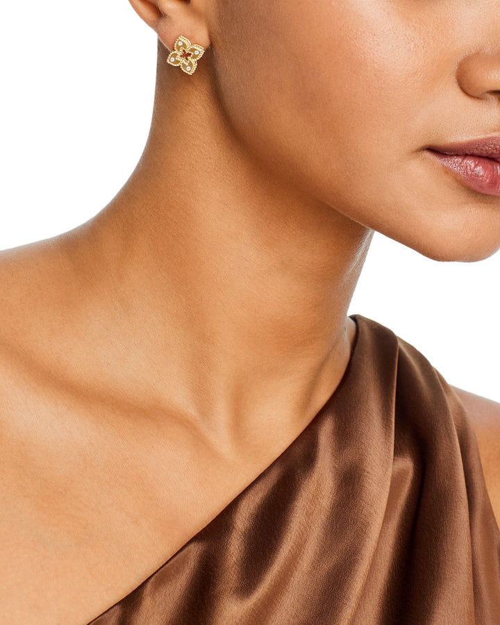 These Petite Venetian Princess Diamond Quatrefoil Stud Earrings by Roberto Coin are a timeless expression of elegance. Featuring a classic quatrefoil design accented with diamonds, these studs add a refined touch to any ensemble, perfect for everyday wear or special occasions.