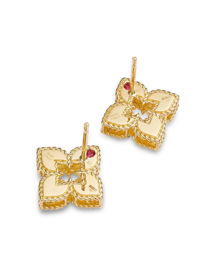 Handcrafted in 18K yellow gold. Features diamonds (0.05 ct. t.w.; GH/SI color/clarity). Earrings measure 0.6'L. Post back closure. Includes Roberto Coin’s signature synthetic ruby on the interior. All gemstone carat weights are approximate; variance may be 0.05 carat. Made in Italy.
