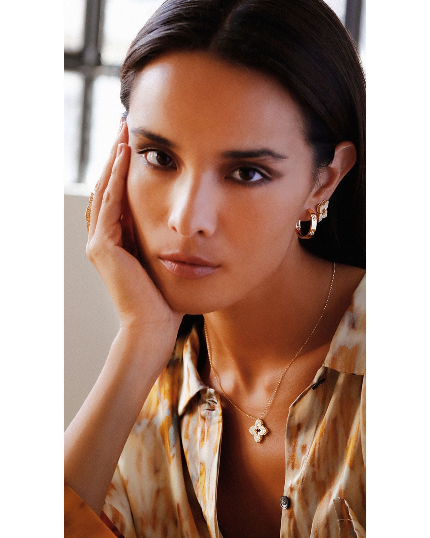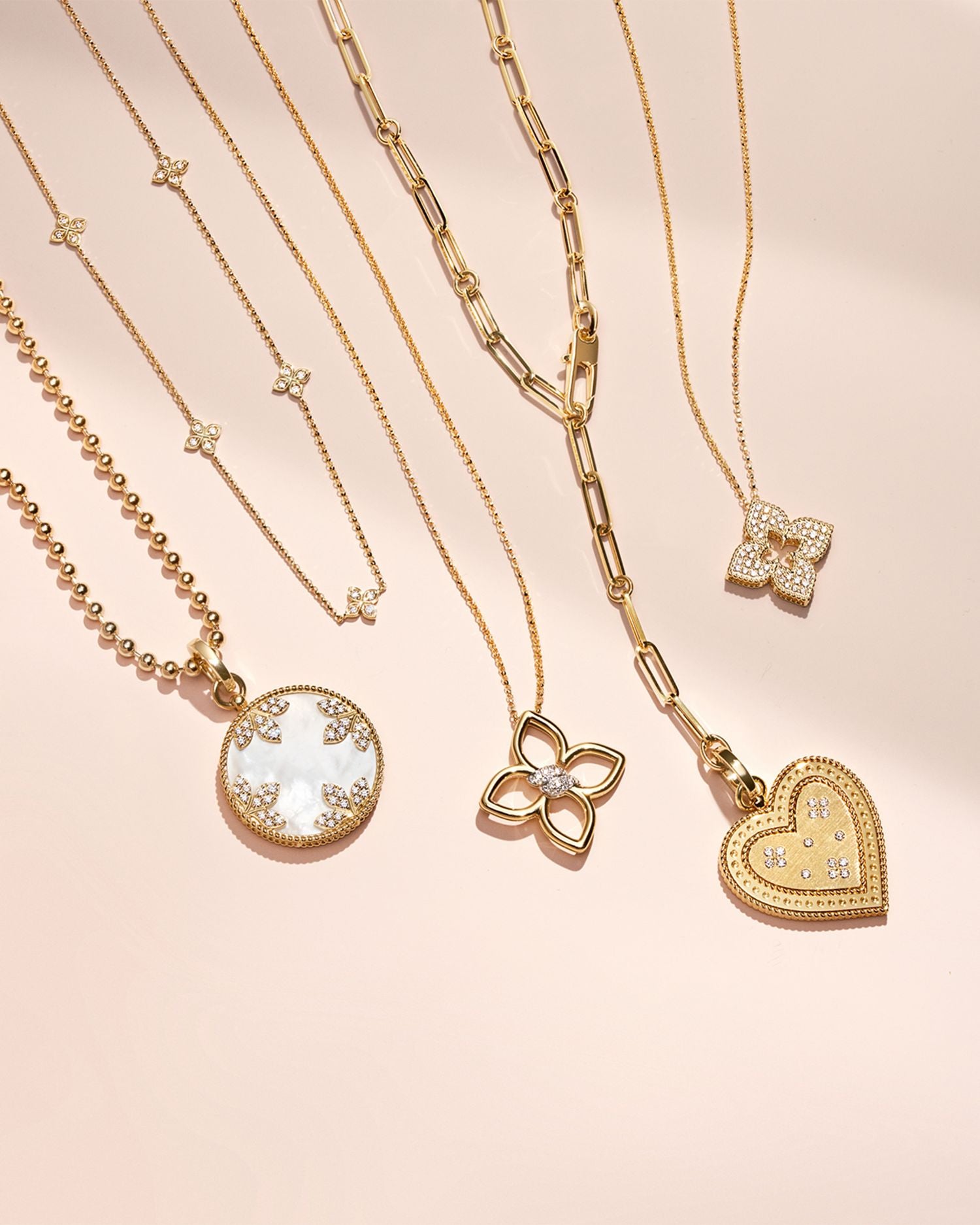 This Venetian Princess Diamond Flower Pendant Necklace by Roberto Coin features a dazzling flower pendant adorned with diamonds, making it a radiant addition to any collection. The 18K yellow gold chain complements the sparkling pendant, making it perfect for everyday wear or special occasions.
