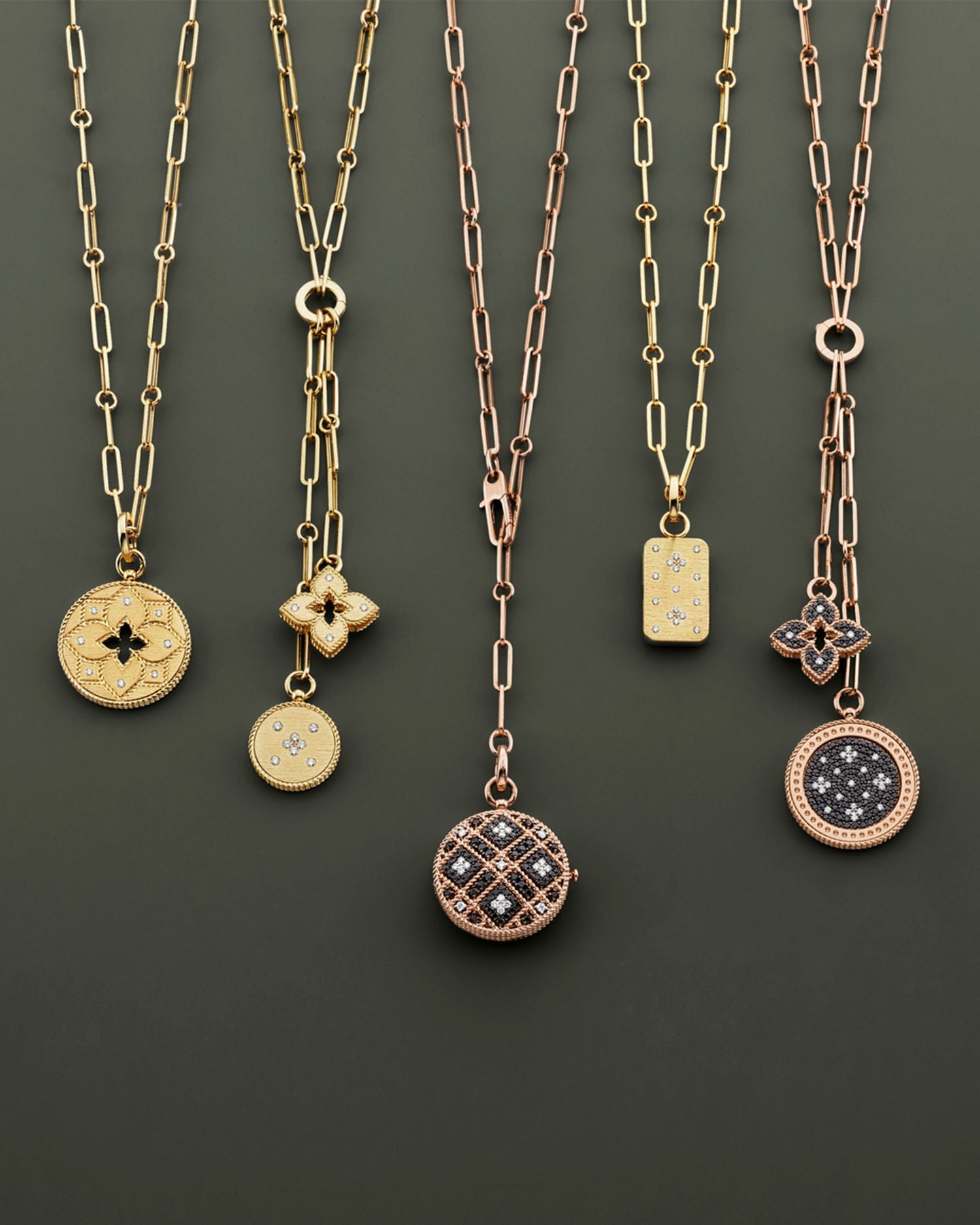 This Venetian Princess Diamond Flower & Disc Pendant Y Necklace by Roberto Coin is a stunning design combining diamond-accented flower and disc pendants hanging from an elegant oval link chain. A perfect balance of sparkle and sophistication for any occasion.