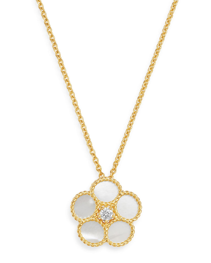 This Daisy Mother-of-Pearl and Diamond Pendant Necklace by Roberto Coin is an exclusive design featuring a daisy-shaped mother-of-pearl pendant with a sparkling diamond center. This elegant necklace adds a soft yet sophisticated touch to any ensemble.