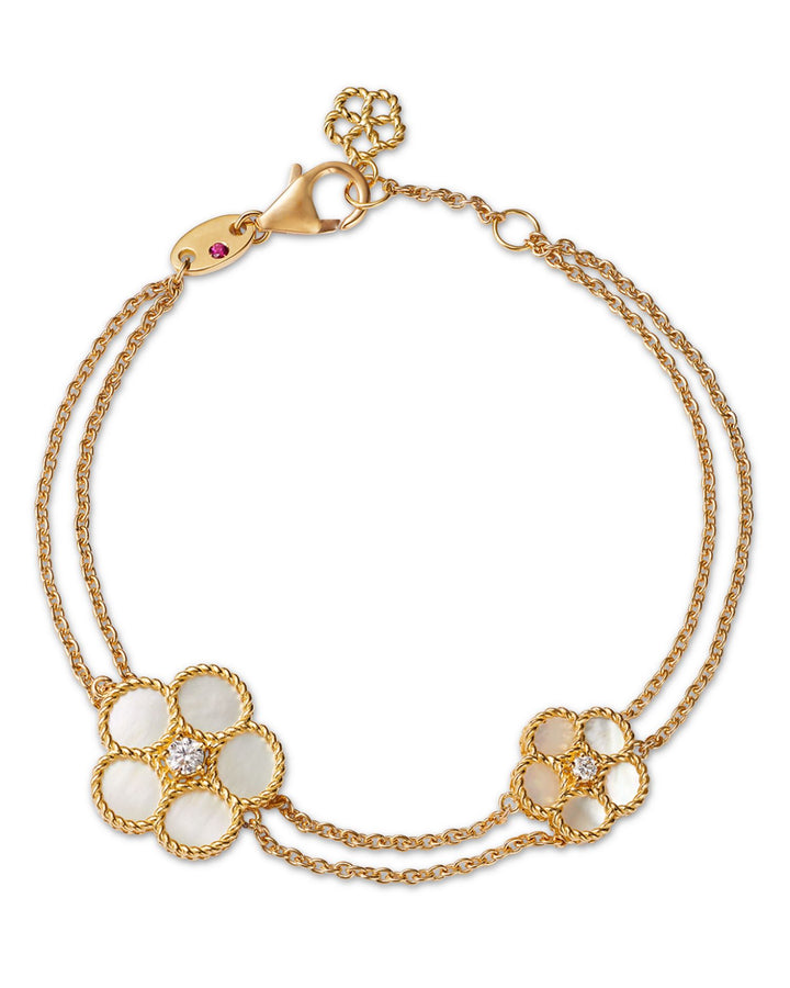 This 18K Yellow Gold Daisy Mother-of-Pearl & Diamond Bracelet by Roberto Coin is a beautiful piece featuring two mother-of-pearl daisies with diamond centers. Its intricate design adds an elegant touch to any occasion.
