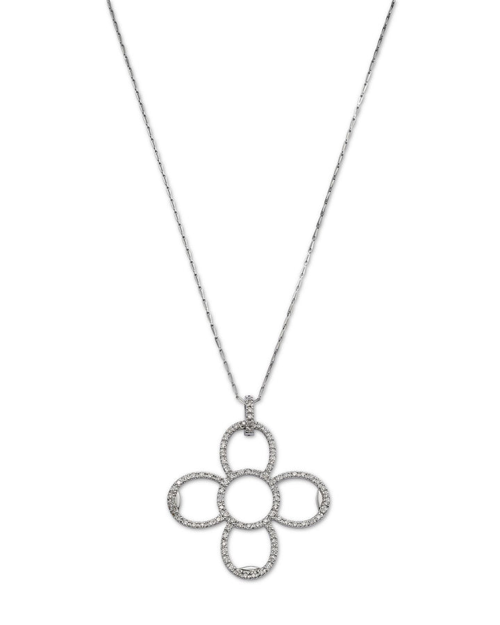 This Diamond Daisy Flower Pendant Necklace by Roberto Coin features a delicate diamond-encrusted pendant, bringing a touch of elegance and sparkle. Set in 18K white gold, it’s perfect for adding a refined touch to any outfit.