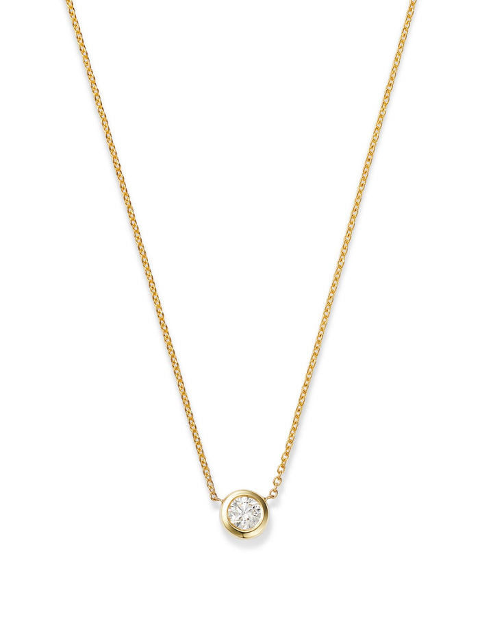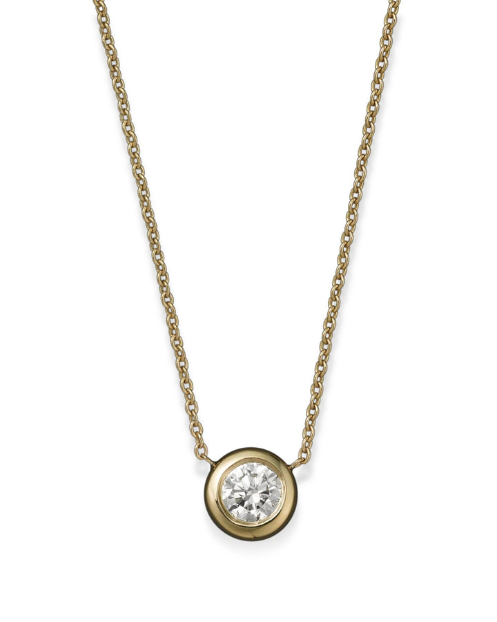 This Diamond Bezel Pendant Necklace by Roberto Coin is a refined and timeless design. The bezel-set diamond is suspended on a delicate 18K yellow gold chain, making it a versatile piece for any occasion.