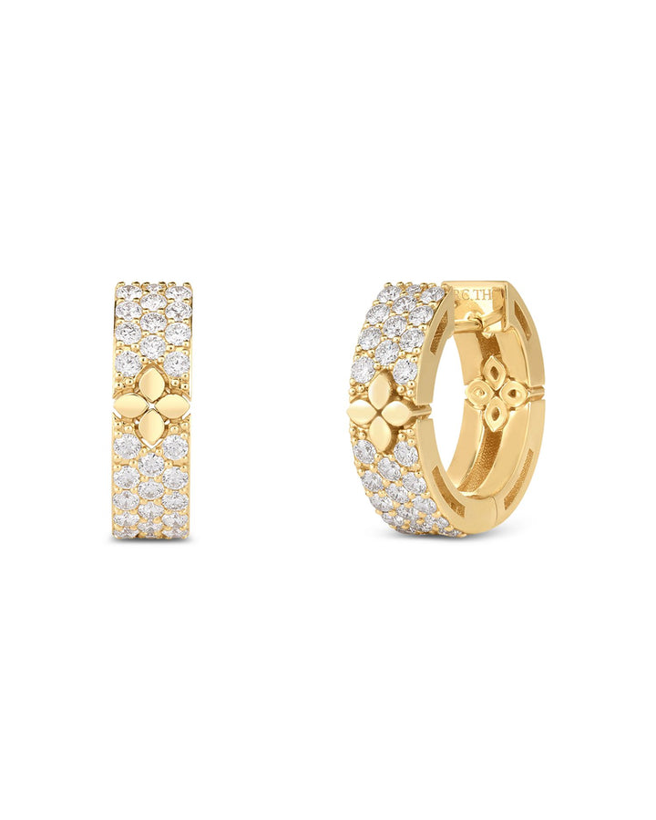 These Love in Verona Hoop Earrings with Diamonds by Roberto Coin are adorned with pavé diamonds along the front, finished with a floral detail for a refined and sophisticated design. The perfect earrings for adding sparkle to your everyday style.