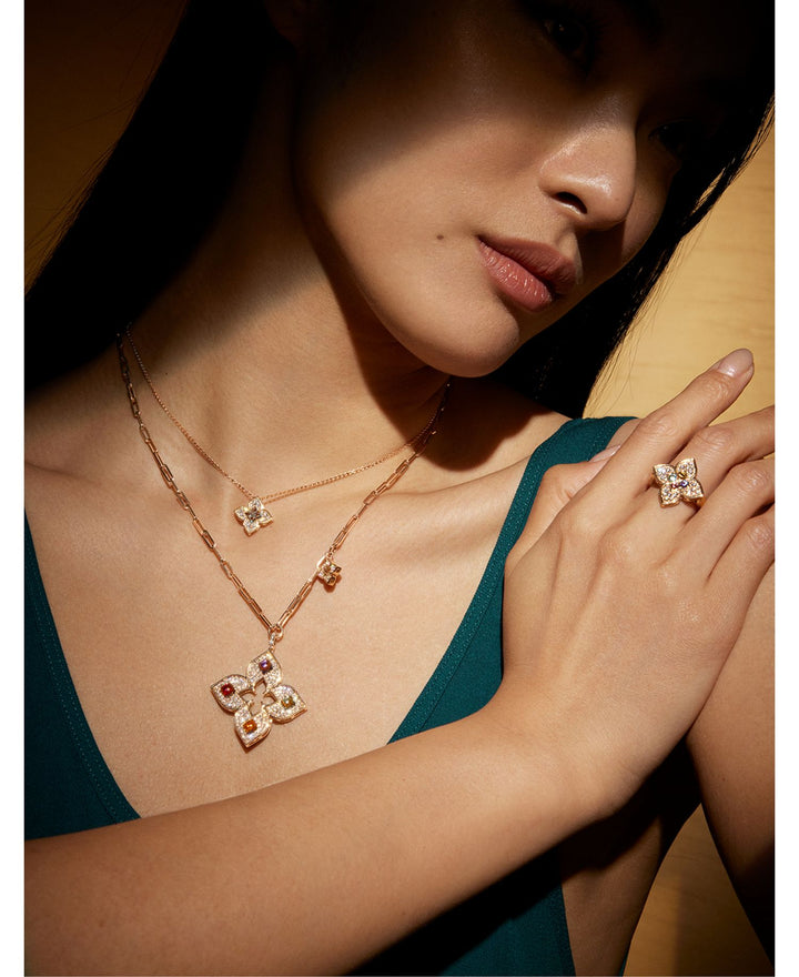 Handcrafted in 18K rose gold. Features diamonds (0.17 ct. t.w.; GH/SI color/clarity) and blue topaz. Pendant measures 0.59'L. Chain length is adjustable between 16-17'. Features a lobster clasp closure. Almost all gemstones and blue and black diamonds have been treated to enhance their beauty and require special care. All gemstone carat weights are approximate; variance may be 0.05 carat. Includes Roberto Coin’s signature synthetic ruby on the interior. Made in Italy.