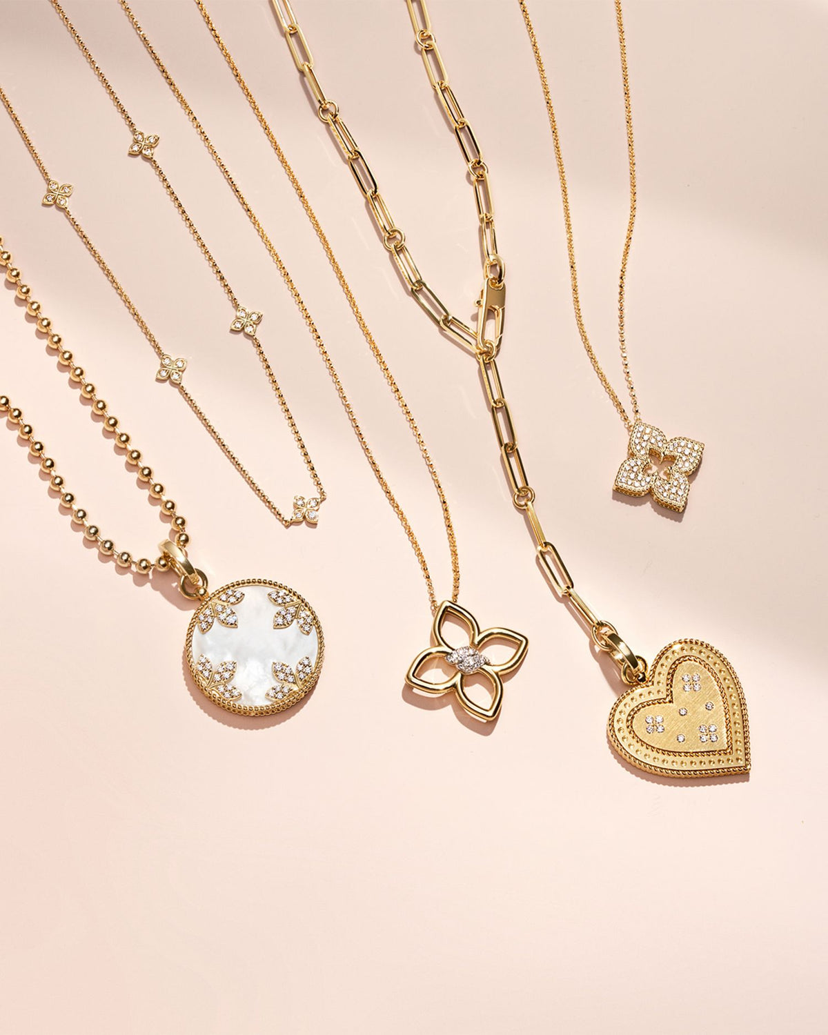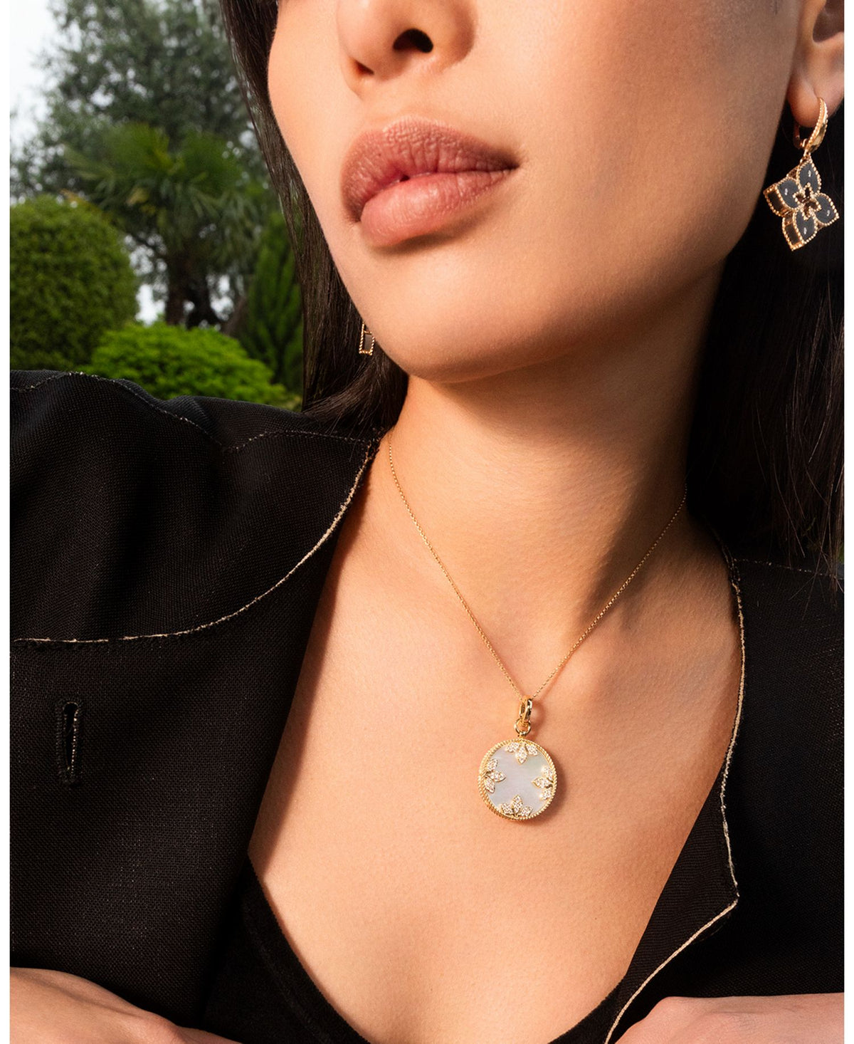 Handcrafted in 18K yellow gold. Features diamonds (0.52 ct. t.w.; GH/SI color/clarity) and mother-of-pearl. Pendant measures 1'L. Chain sold separately. Almost all gemstones and blue and black diamonds have been treated to enhance their beauty and require special care. All gemstone carat weights are approximate; variance may be 0.05 carat. Includes Roberto Coin’s signature synthetic ruby on the interior. Made in Italy.