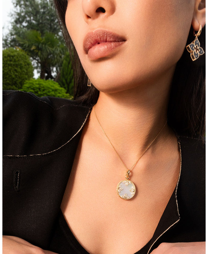 This Medallion Diamond & Mother of Pearl Pendant by Roberto Coin from the Medallion collection features a sparkling floral diamond motif surrounding lustrous mother-of-pearl. Set in 18K yellow gold, it’s a sophisticated design that adds elegance and timeless beauty to any collection.