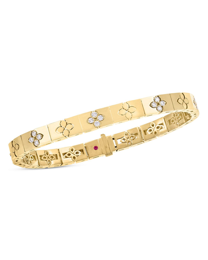 This 18K Yellow Gold Love in Verona Diamond Flower Link Bracelet by Roberto Coin from the Love in Verona Collection features alternating links of polished gold and diamond flowers, illuminating this beautiful bracelet with a touch of sparkle.