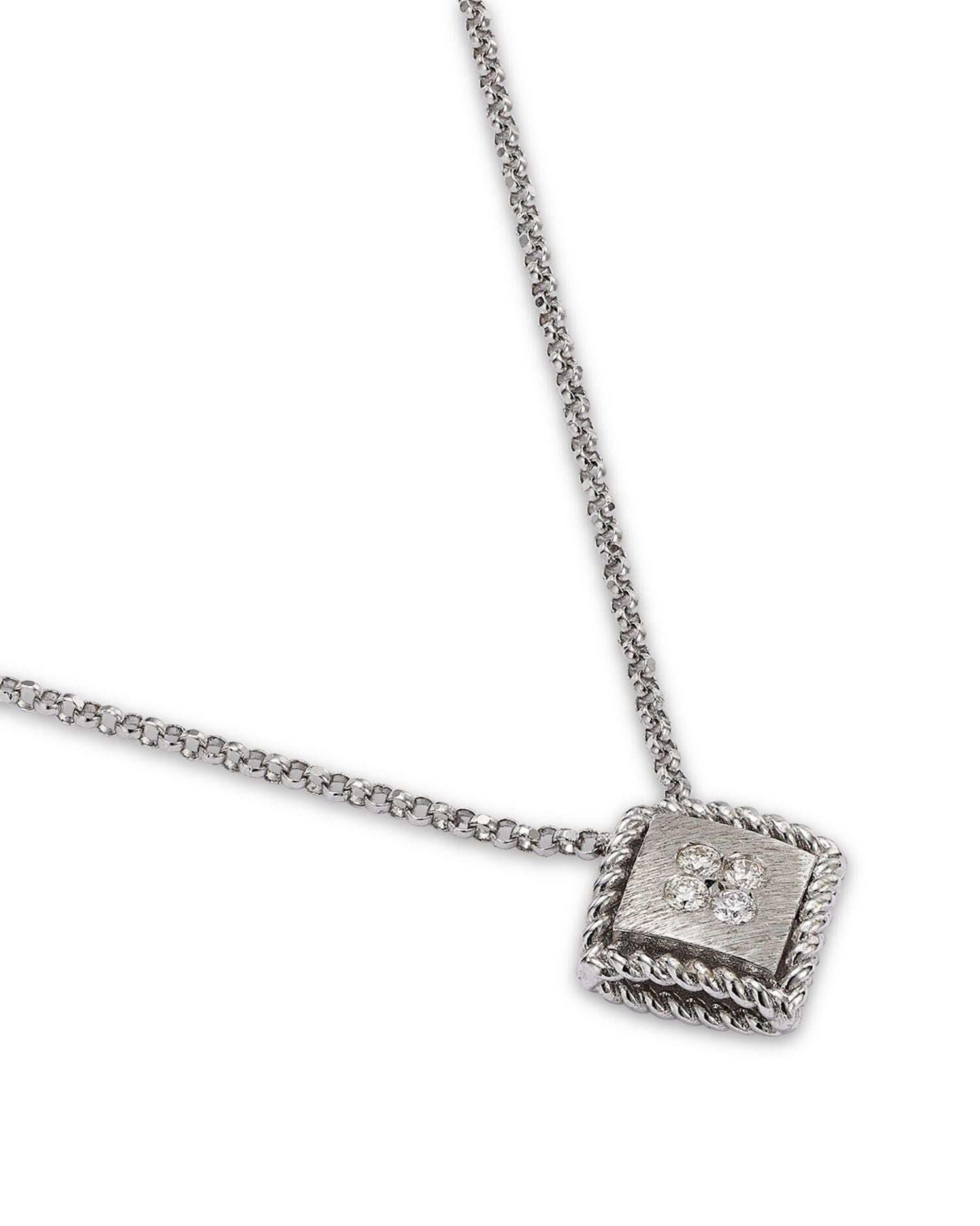 This Diamond Palazzo Ducale Pendant Necklace by Roberto Coin from the Palazzo Ducale collection features an elegant diamond-shaped pendant with a twisting border and four center diamonds. A timeless piece of sophistication.