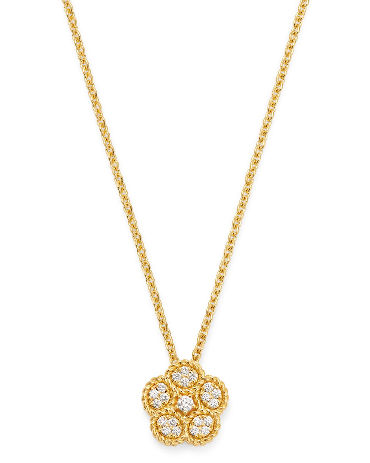 This Daisy Diamond Pendant Necklace by Roberto Coin features a diamond-encrusted daisy pendant, hanging gracefully from a gold chain. A perfect balance of simplicity and sparkle.