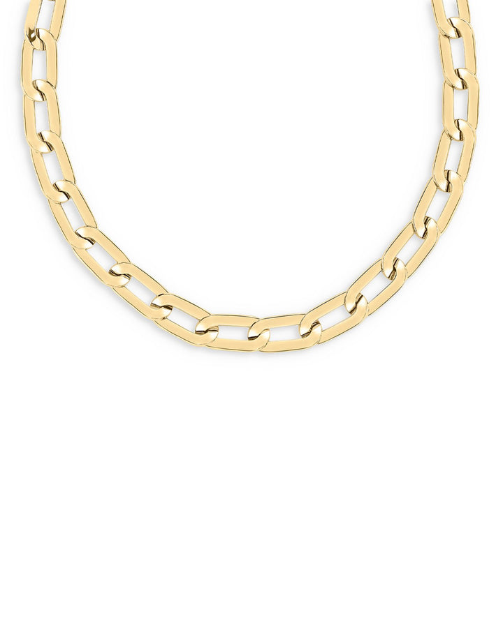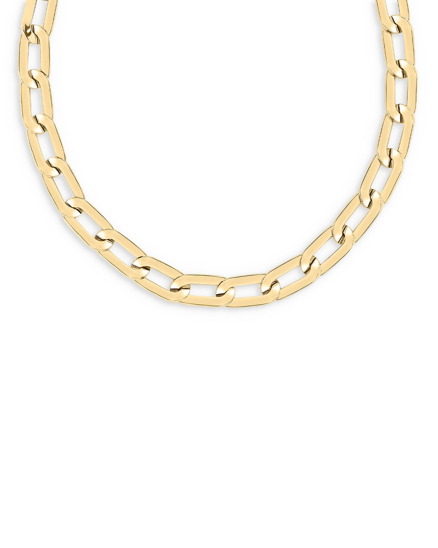 This Chunky Link Collar Necklace by Roberto Coin in 18K gold features large gleaming links, forming a bold and stylish statement necklace. Its striking design adds elegance and sophistication to any outfit.