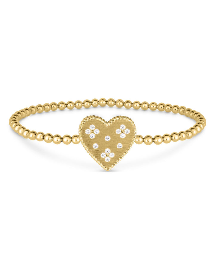 This 18K Yellow Gold Diamond Venetian Princess Heart Beaded Stretch Bracelet by Roberto Coin, from the Venetian Princess collection, features a delicate heart charm with glittering diamond flowers. Its stretchy beaded design makes it effortlessly elegant and comfortable to wear.