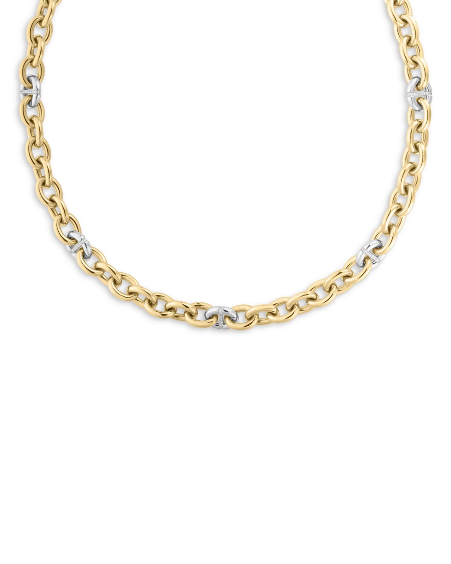 This 18K White & Yellow Gold Chains Diamond Link Collar Necklace by Roberto Coin, from the Gold Chains collection, combines white gold links adorned with sparkling diamonds and a sleek yellow gold chain. The elegant design offers timeless sophistication with a modern edge.