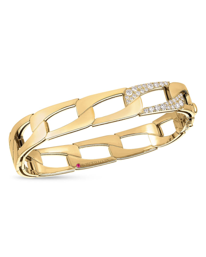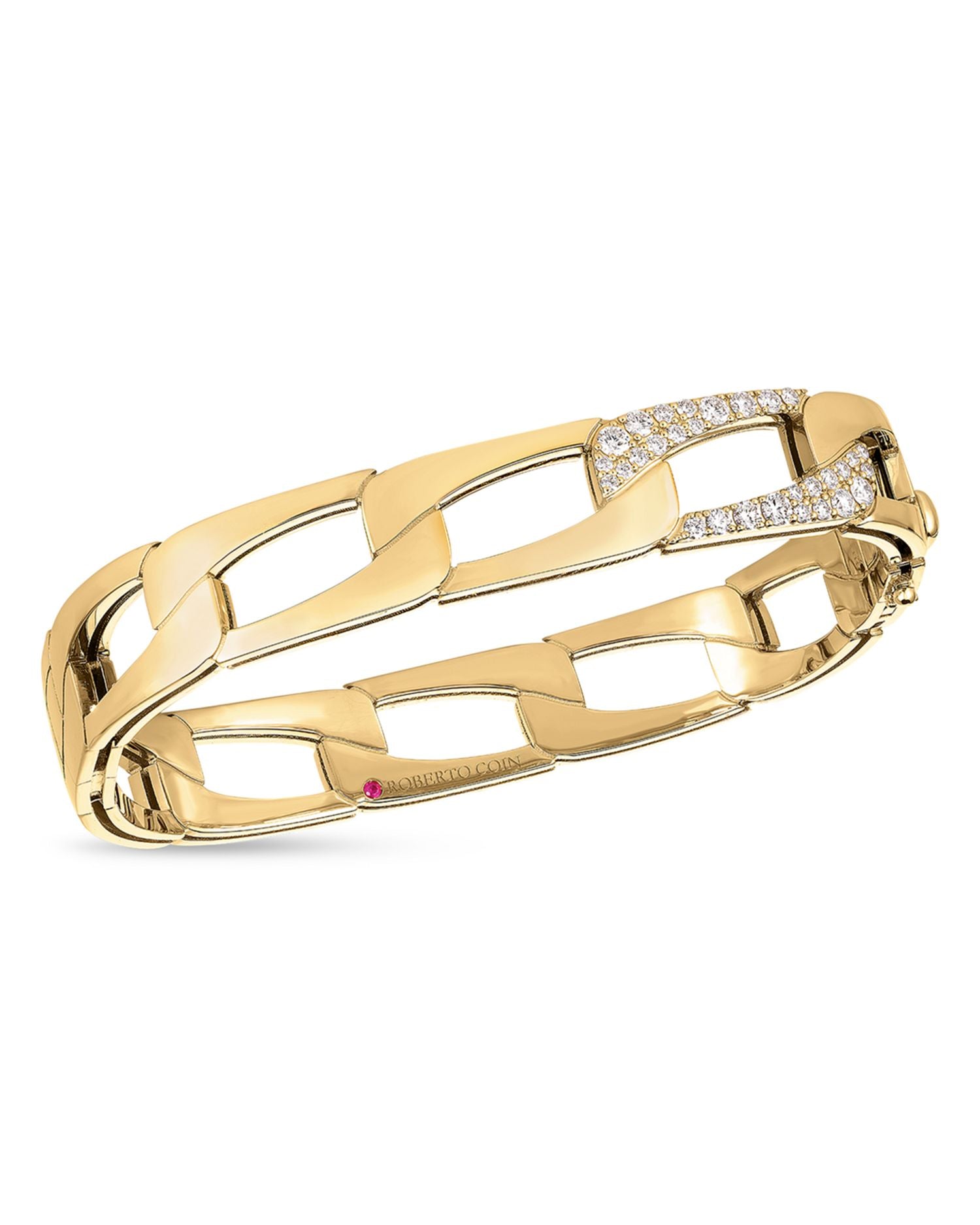 This 18K Yellow Gold Navarra Diamond Pavé Open Link Square Bangle Bracelet by Roberto Coin, from the Navarra collection, adds a glistening touch to your wrist. Its square link design and pavé diamond accents combine modern elegance with timeless appeal.
