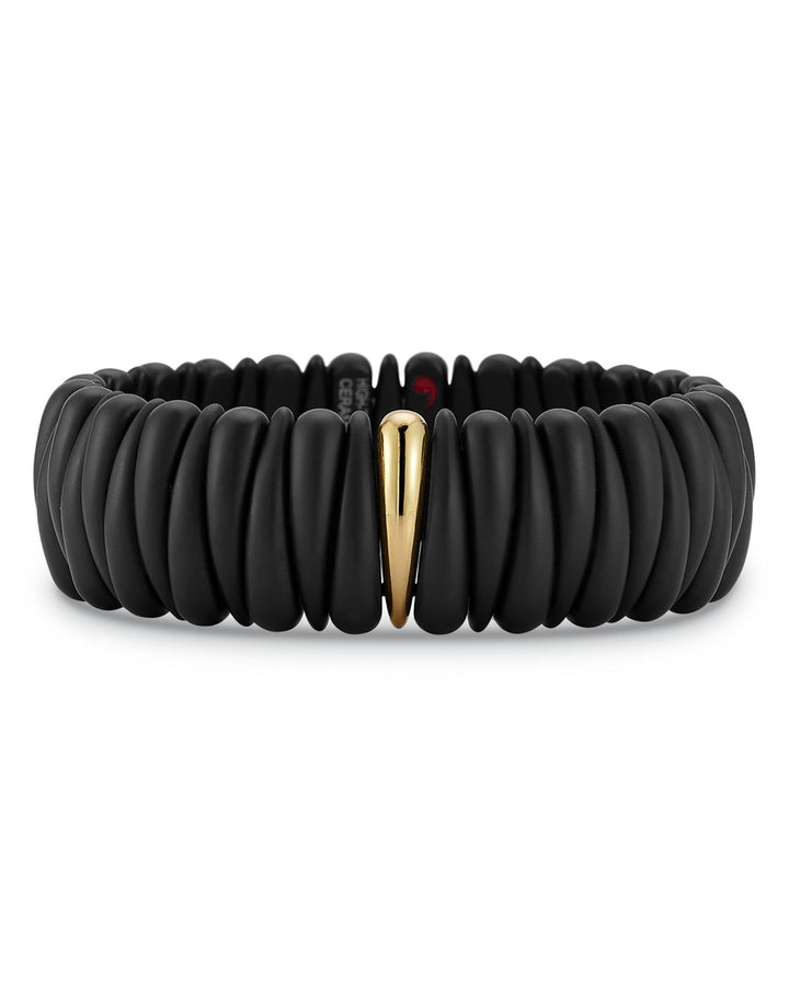 Made in 18K yellow gold and black ceramic. Measures 6.5" in length. Stretch bracelet design. Handcrafted in Italy.
