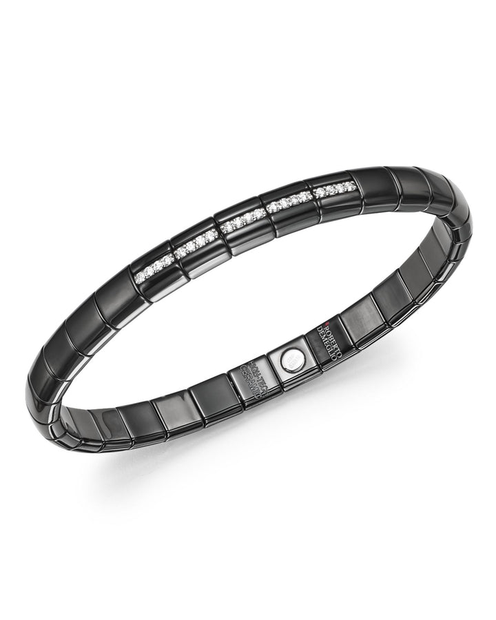 This 18K White Gold & Black Ceramic Pura Stretch Bracelet with Diamonds by Roberto Demeglio features a sophisticated design of black ceramic and diamonds, perfect for adding a touch of sparkle to any outfit.