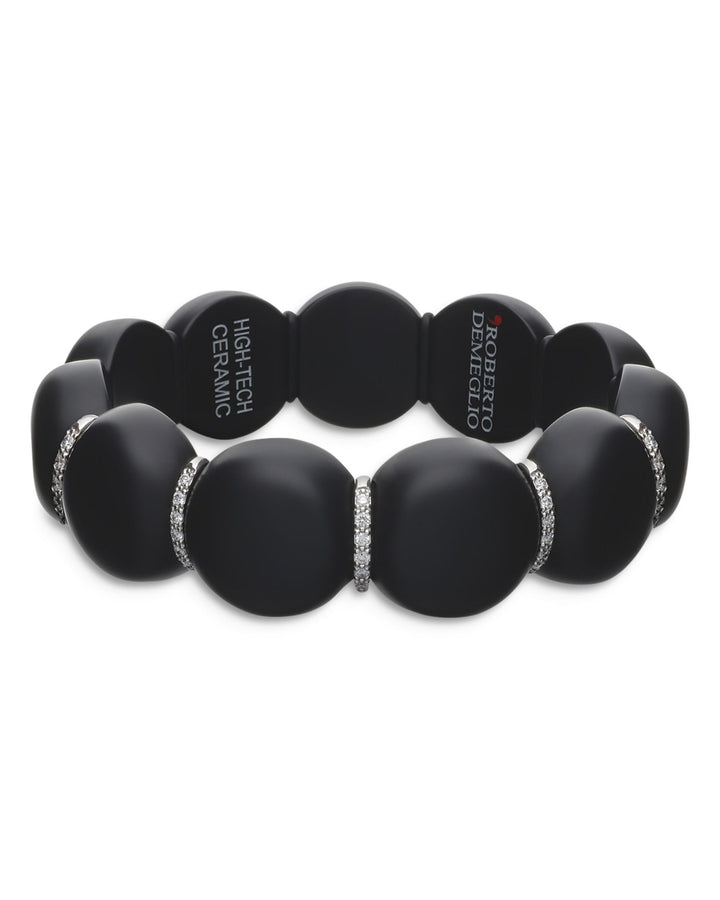 This 18K White Gold Ceramic Stretch Bracelet with Diamonds by Roberto Demeglio offers a refined yet bold design, with five sparkling diamond stations set against the sleek black ceramic.