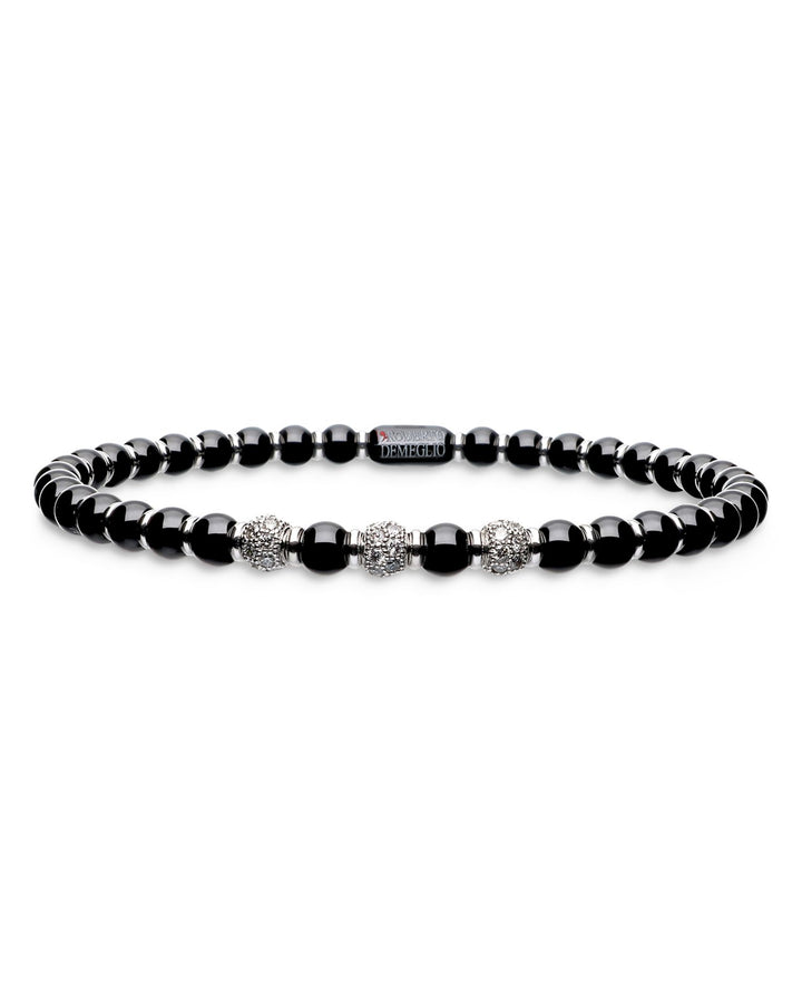This 18K White Gold & Ceramic Stretch Bracelet with Diamonds by Roberto Demeglio features bead accents and three sparkling diamond beads for a touch of elegance and luxury.