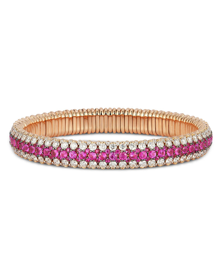 Handcrafted in 18K rose gold with 5.8 ct. t.w. rubies and 6.85 ct. t.w. diamonds (color/clarity: FG/SI2). Length: 6.5'. Almost all rubies are lead-glass filled. All gemstone carat weights (ct. t.w.) are approximate, with variance of 0.05 carat. Made in Italy.