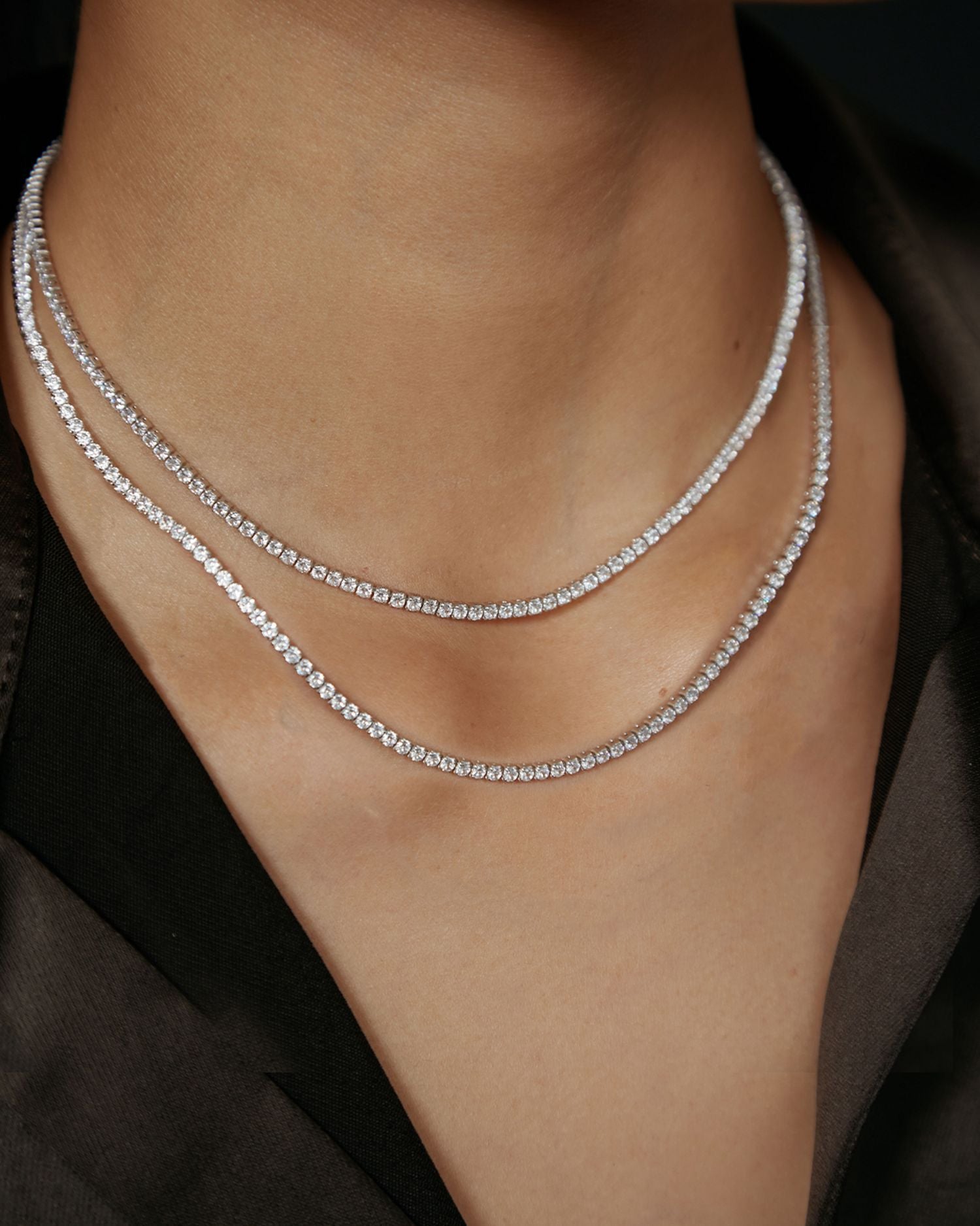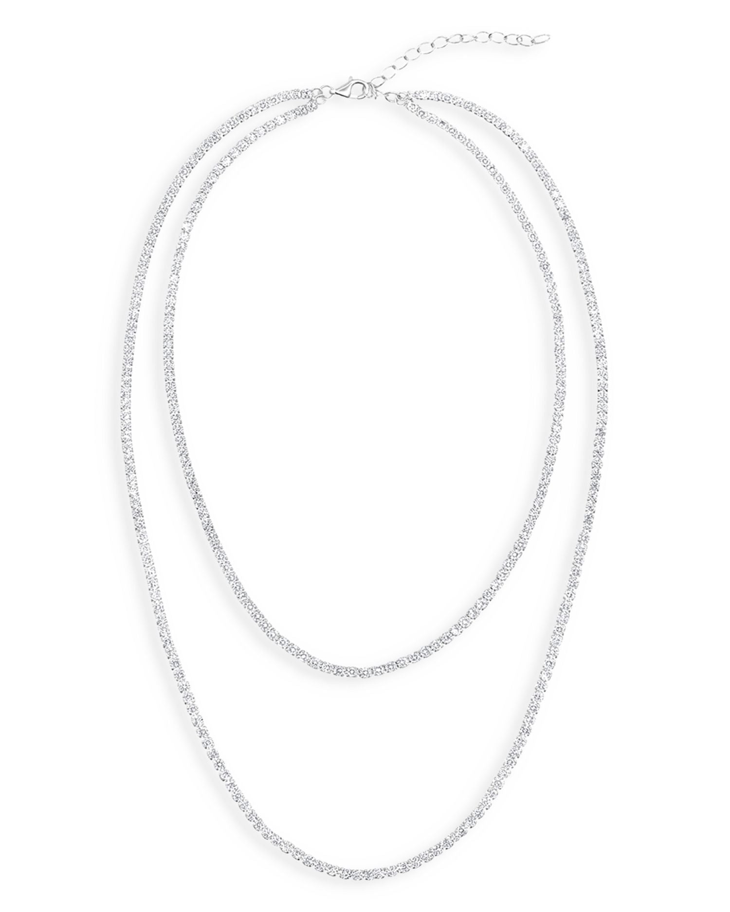 This Double Tennis Necklace by Shashi offers a fresh twist on a classic silhouette. Featuring two rows of sparkling cubic zirconia set in sterling silver, this statement necklace radiates elegance and sophistication. Its adjustable length makes it perfect for layering or wearing solo.