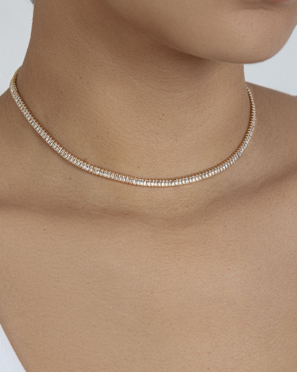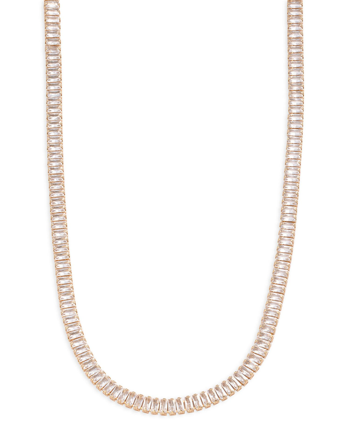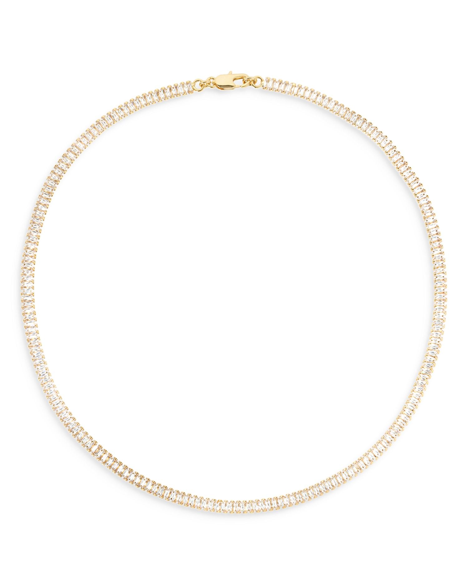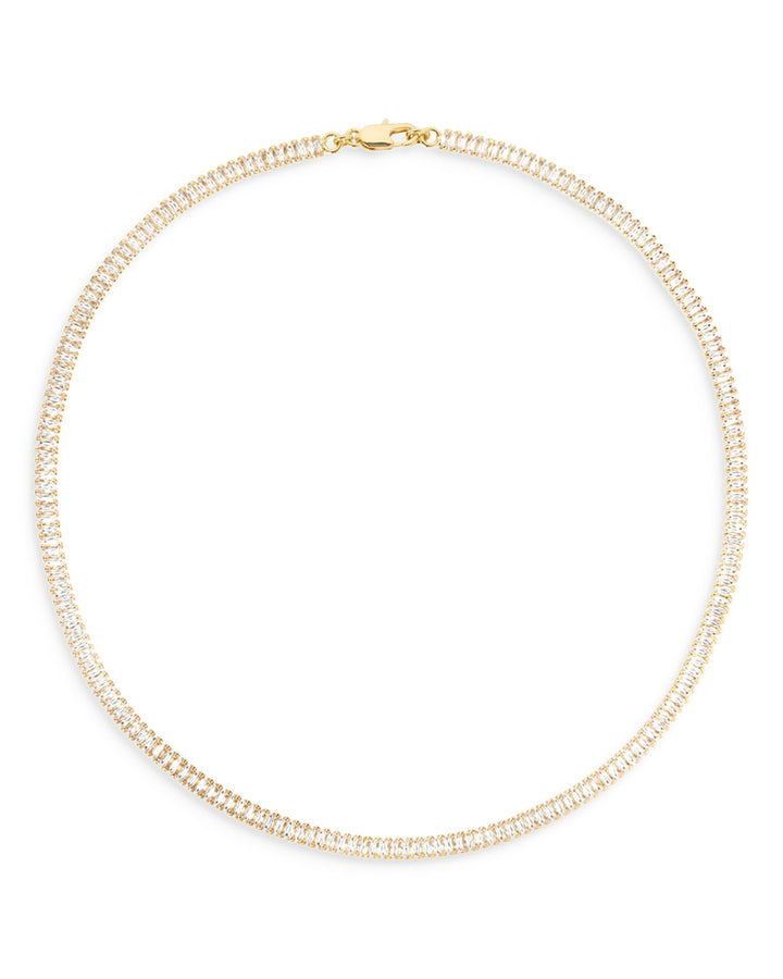 Crafted in 18K gold-plated brass with cubic zirconia. Length: 13.5" with 2" extender. Lobster clasp closure. Made in the USA.