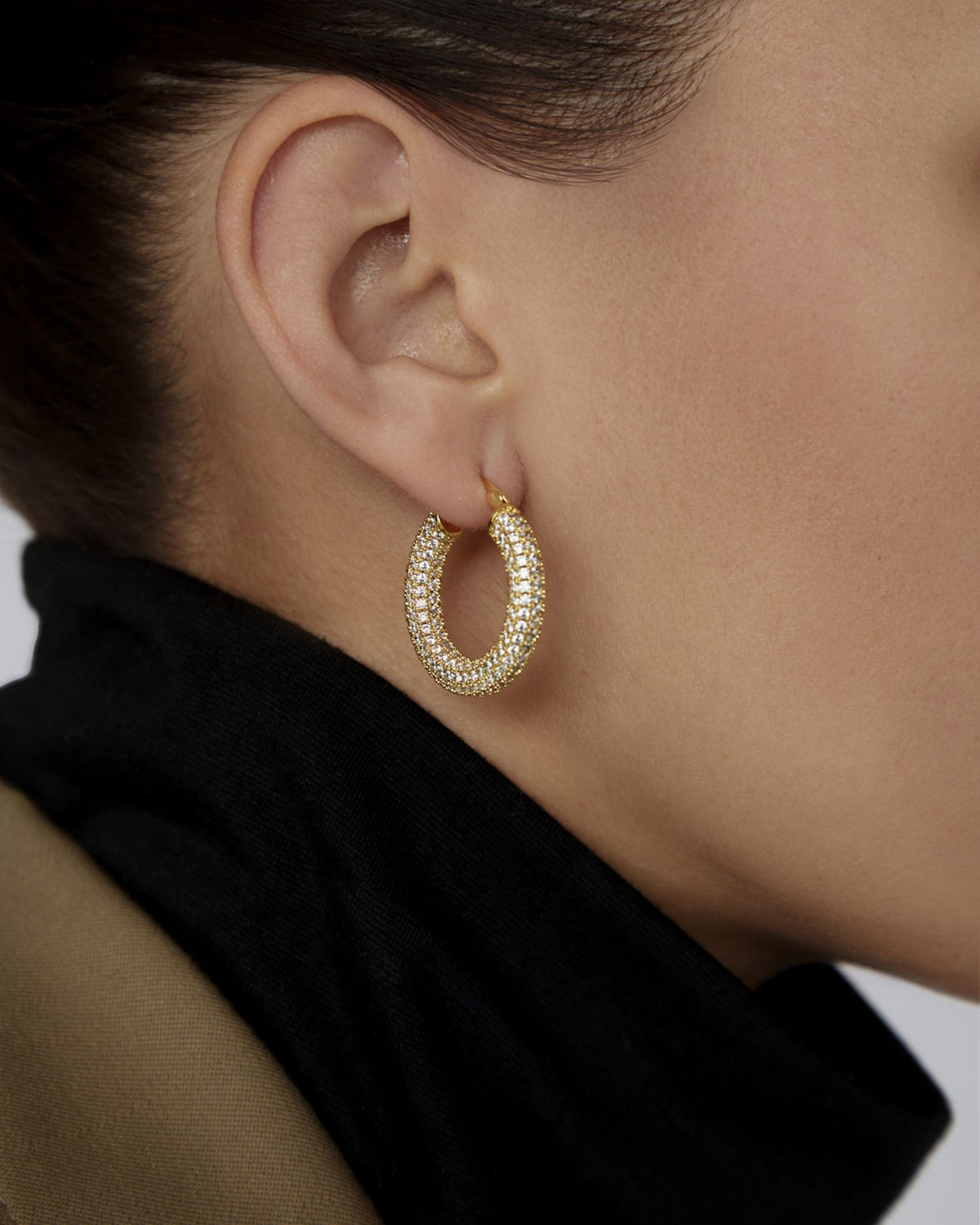 These Dominique Pavé Earrings by Shashi showcase timeless brilliance with their pavé-set cubic zirconia design. Available in gold or silver plating, these earrings feature a click-top closure for a sleek, refined finish.