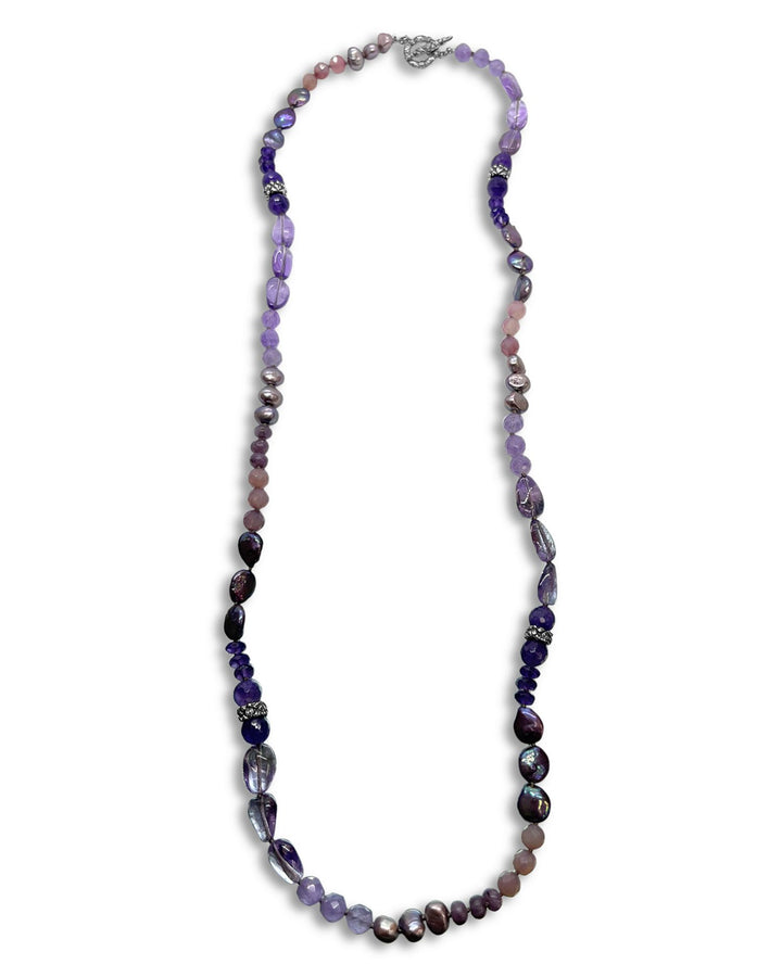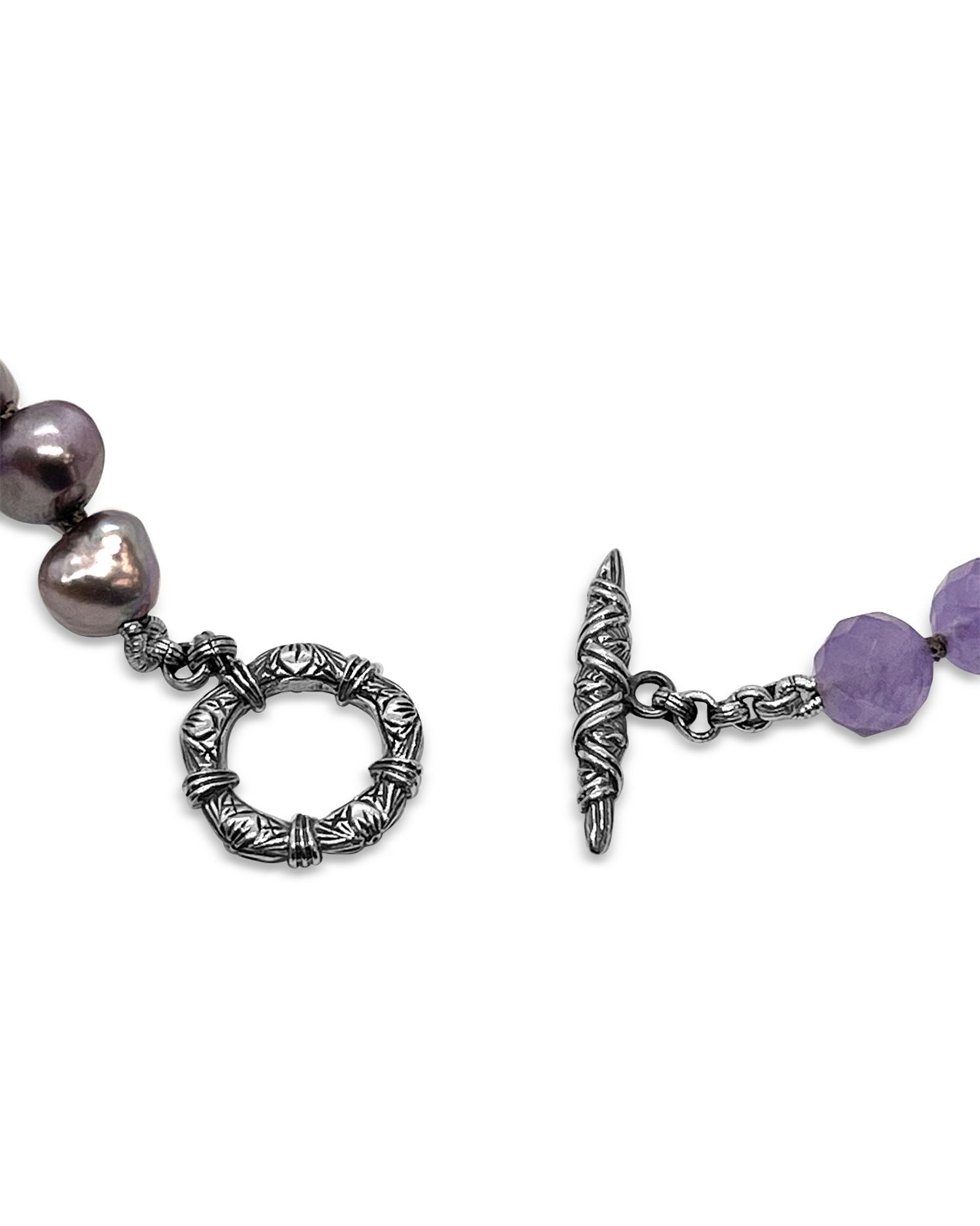 Crafted in sterling silver with amethyst, jade, and cultured freshwater pearls (11mm; 10 x 8mm). Length: 36". Toggle clasp closure. Made in India.