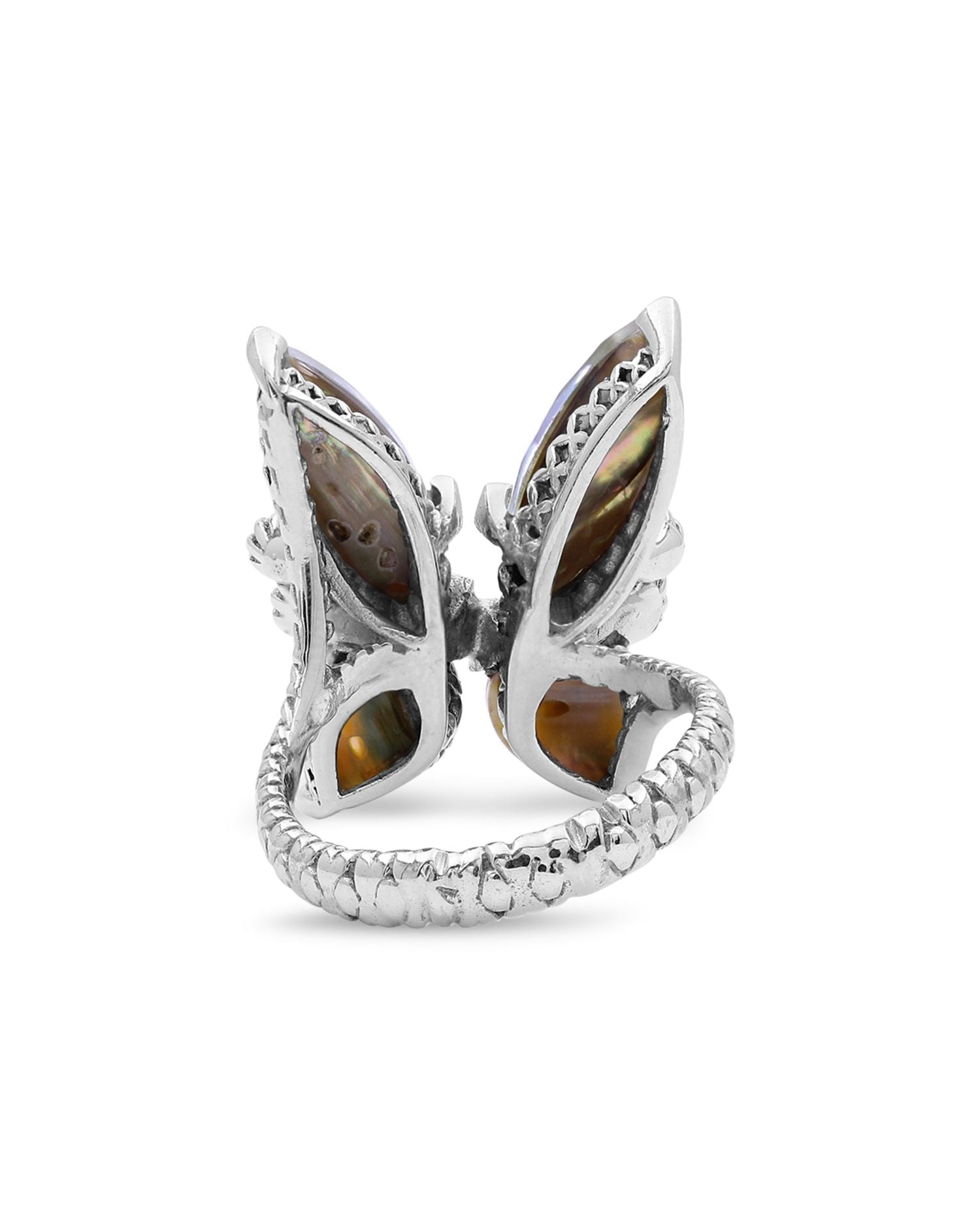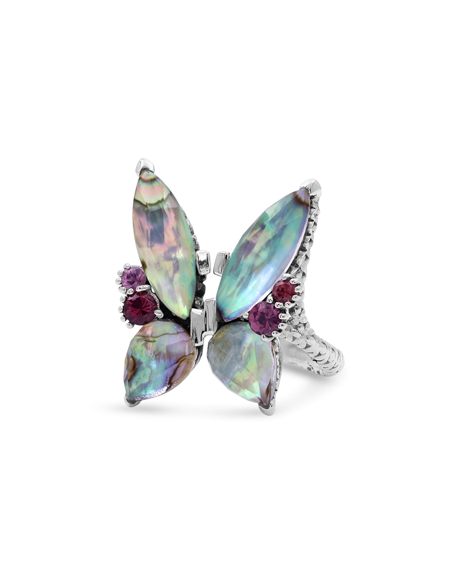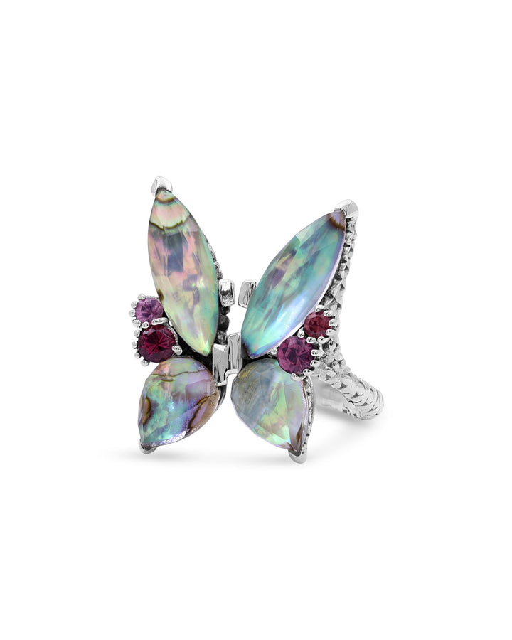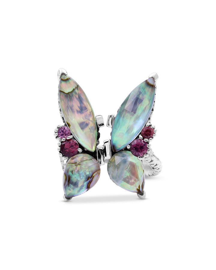 This Faceted Natural Quartz Abalone & Rhodolite Garnet Butterfly Ring by Stephen Dweck features a captivating design with faceted natural quartz, abalone, and rhodolite garnet. The intricate butterfly motif highlights the brand’s artistry and attention to natural beauty.