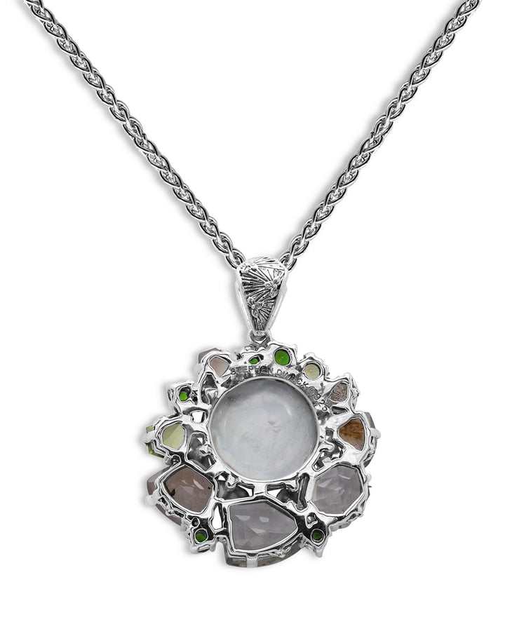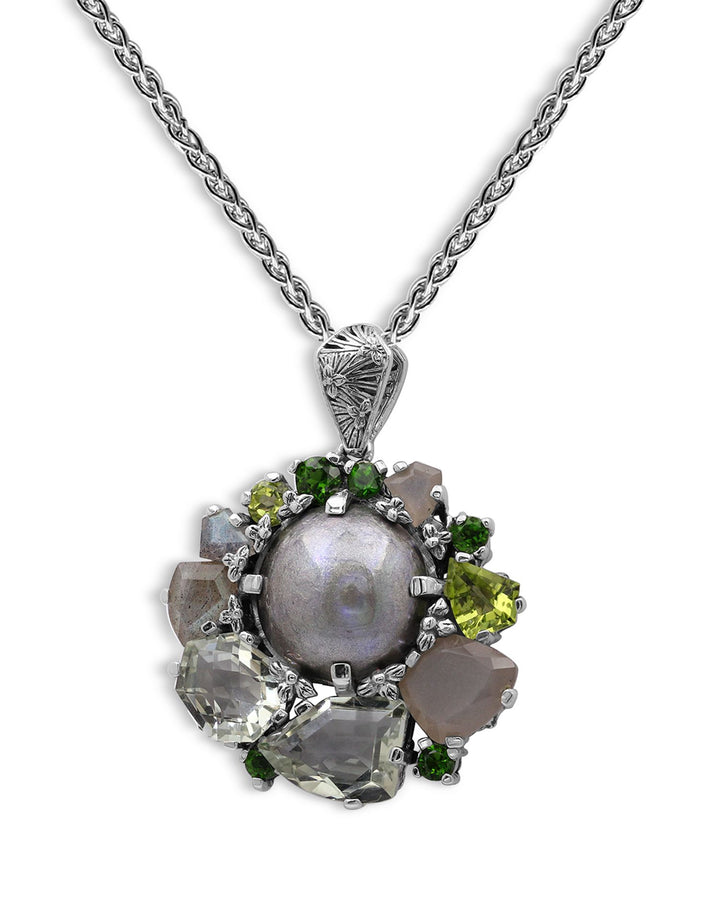 This Mabe Cultured Freshwater Pearl & Gemstone Pendant Necklace by Stephen Dweck combines a lustrous freshwater pearl with a stunning array of moonstone, prasiolite, peridot, labradorite, chrome diopside, and green tourmaline. Its intricate pendant showcases masterful craftsmanship and natural beauty.