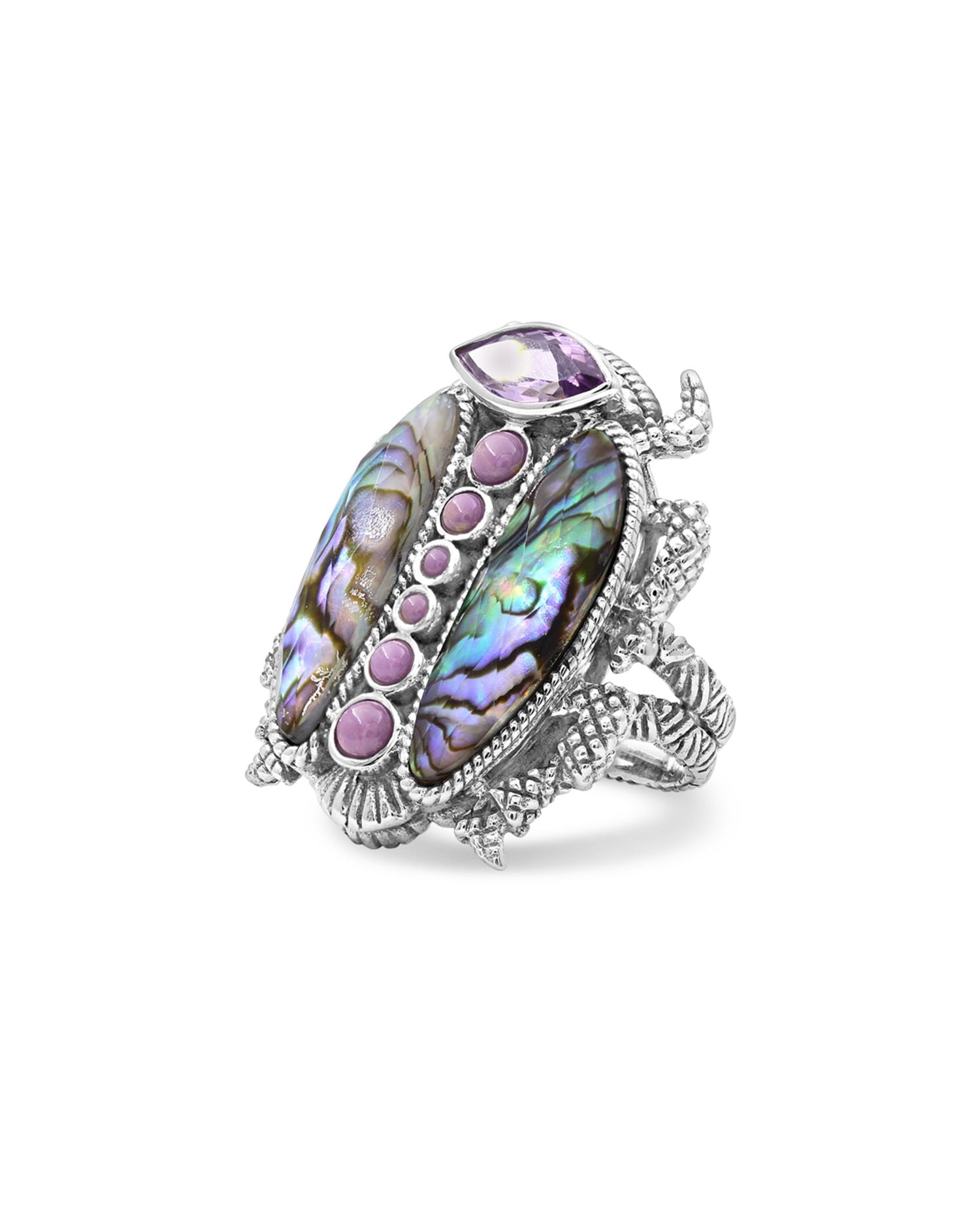 Crafted in sterling silver with amethyst, phosphosiderite, natural quartz, and abalone. Made in India.