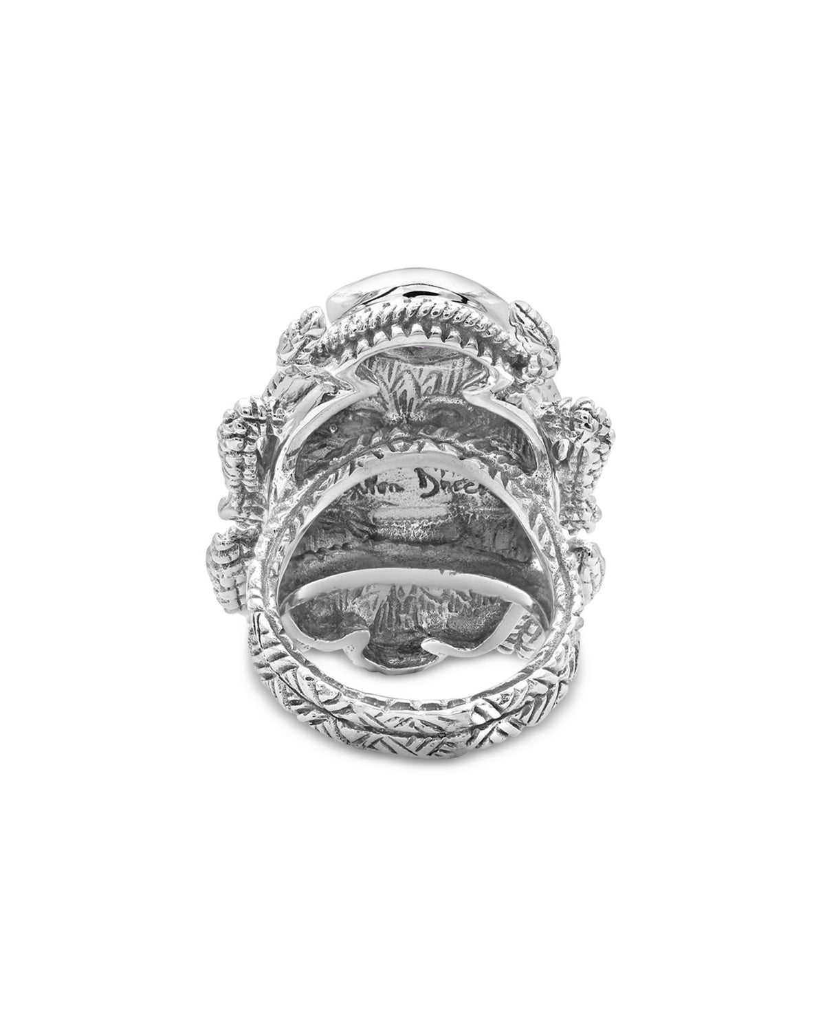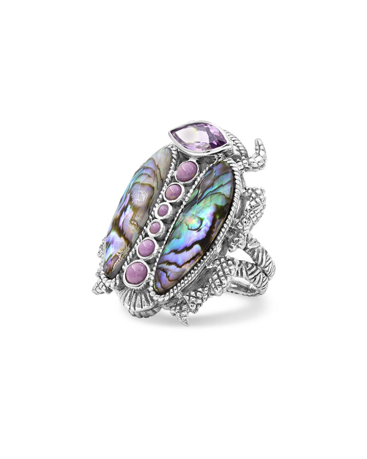 This Garden of Stephen Mixed Stone Scarab Ring by Stephen Dweck, from the Garden of Stephen collection, showcases an intricately designed scarab motif. Combining amethyst, phosphosiderite, natural quartz, and abalone, this ring is a bold and symbolic statement piece celebrating nature’s beauty.