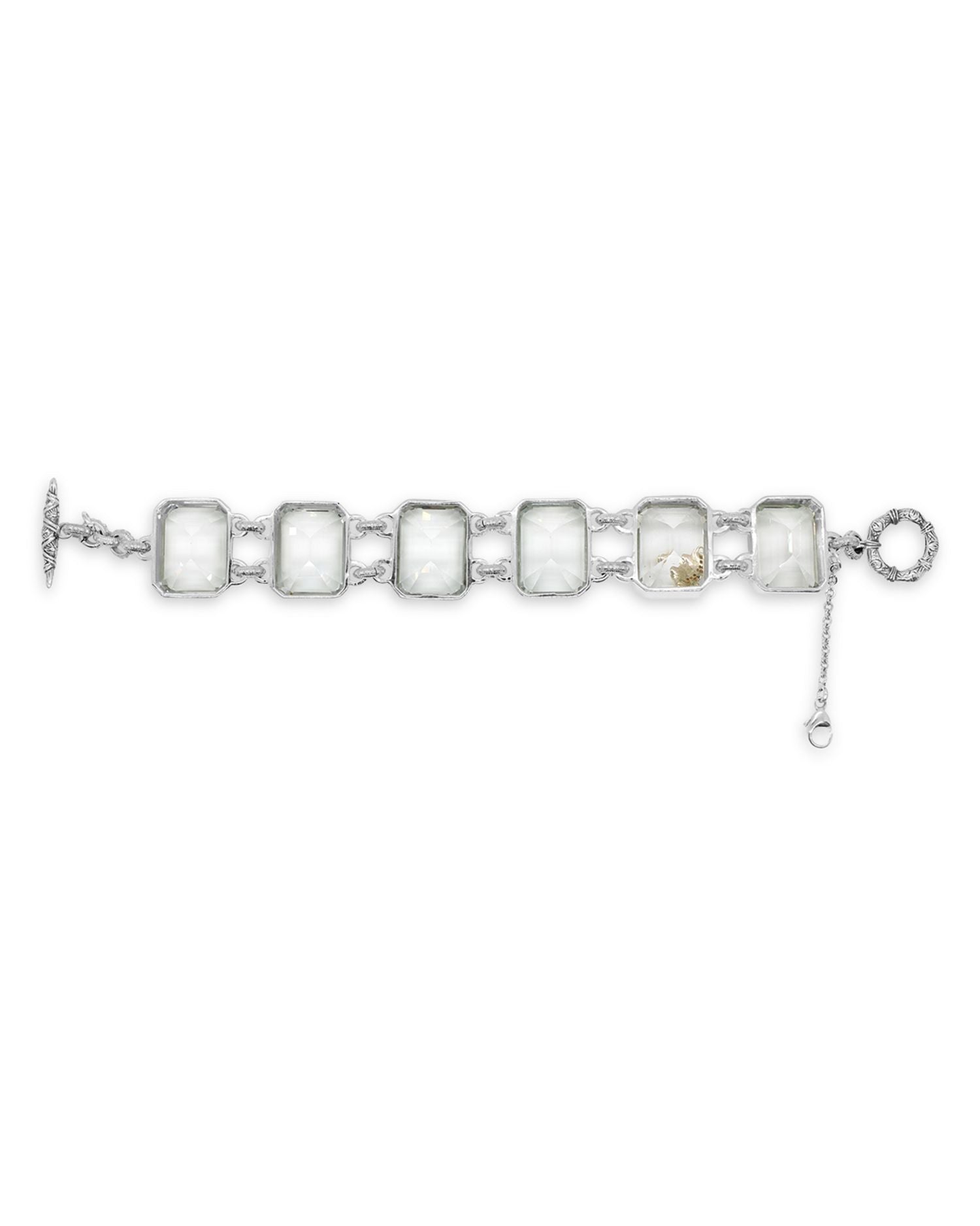 This Sterling Silver Quartz Bracelet with Diamonds from the One of a Kind collection by Stephen Dweck features a chunky gemstone design with a luxurious 0.65 ct. t.w. of diamonds. The bracelet is further enhanced by a gold Adam bug, adding both artistic flair and unique symbolism. This bracelet is ideal for those seeking a statement piece with a blend of bold gemstones and refined elegance.