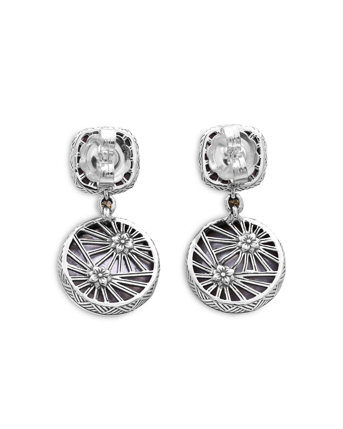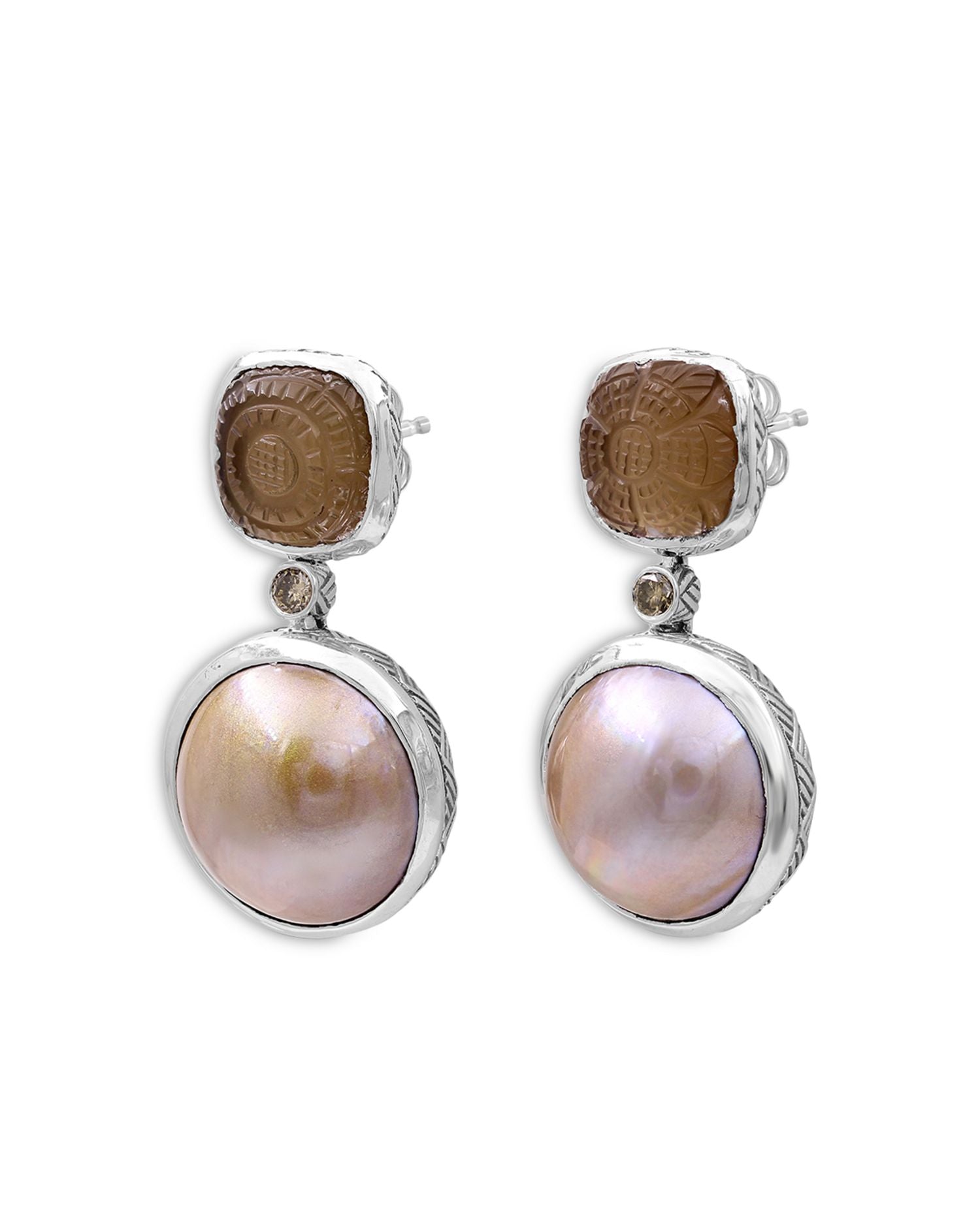 These Carventurous Hand Carved Earrings with Champagne Diamonds by Stephen Dweck, from the Carventurous collection, showcase a hand-carved floral design accented with natural quartz, mother of pearl, and sunstone. Subtle champagne diamonds add a touch of refined sparkle.