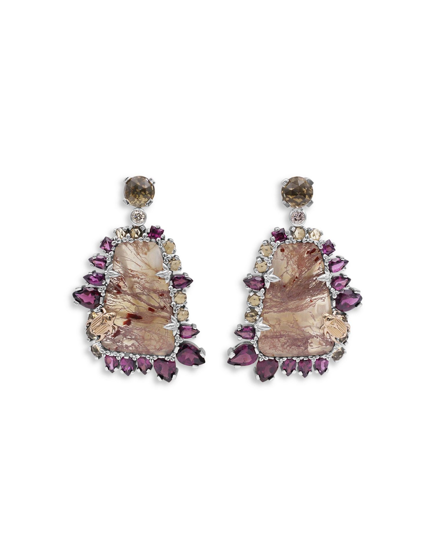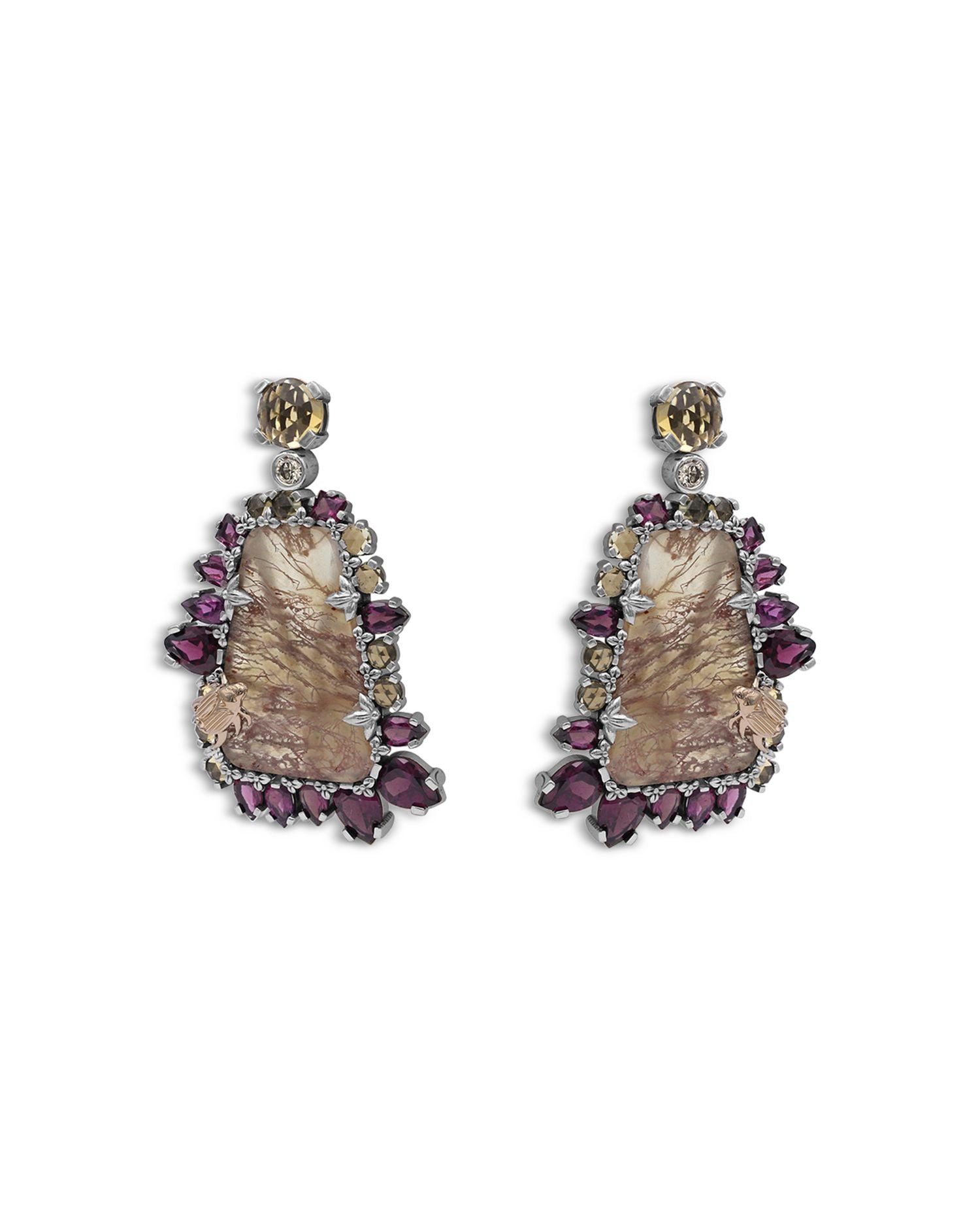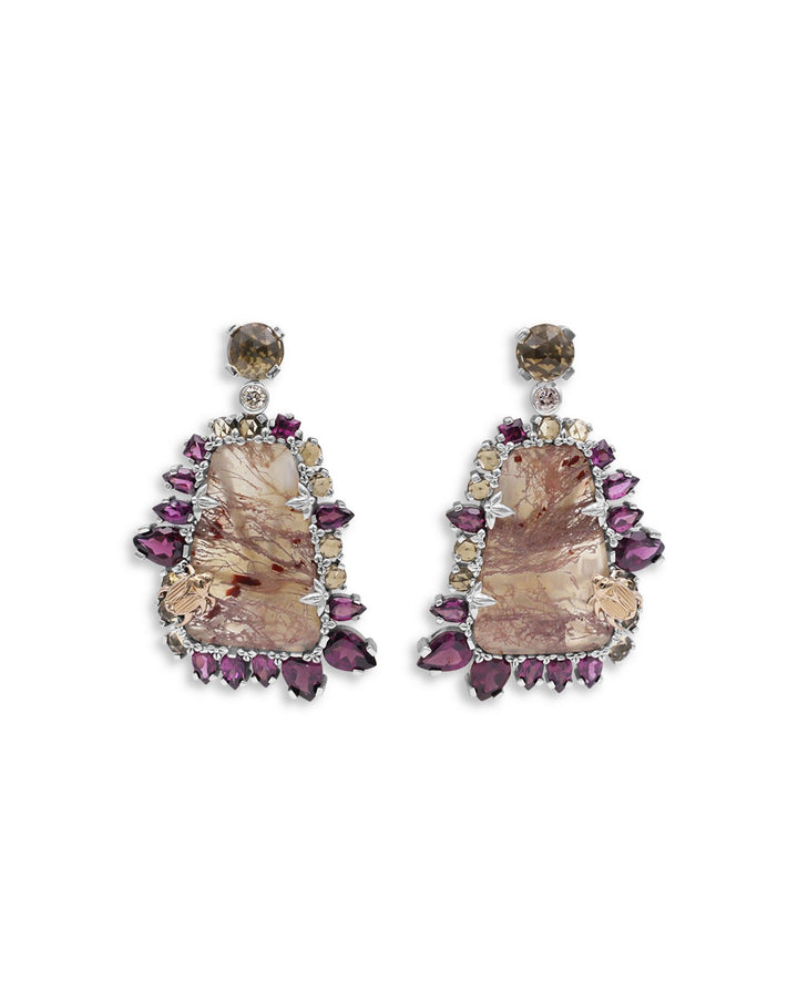 Crafted in 18K yellow gold and sterling silver with whisky quartz, rhodolite, garnet, and champagne diamonds totaling 0.2 ct. t.w. Length: 1.83'. Post back closure. Made in India.