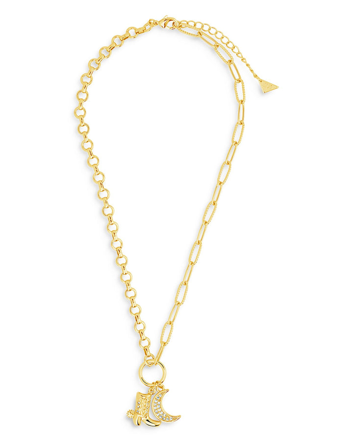 This Kelsea Boot & Moon Pendant Necklace by Sterling Forever, from the Kelsea collection, adds a playful touch with its whimsical boot and crescent moon charms. Accented with shimmering cubic zirconia, this gold-tone necklace offers a unique and charming statement.